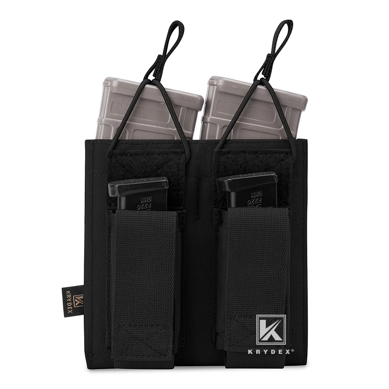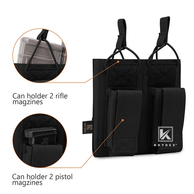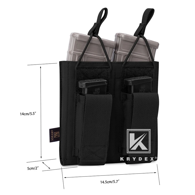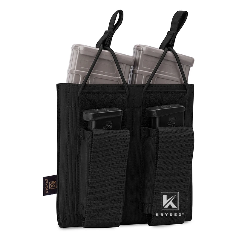 Feature:*Color : Black, Ranger Green, Coyote Brown, Camo* Modular Four magazine pouches, Two fits for 5.56 .223 Mag and Two fits for Pistol magazine.* Magazines secured by bungee retention with a loop* Pistol mag pouch in the front with hook & loop fastener flap.* Top opening style for quick draw.* Modular webbing on back and compatible with all MOLLE and PALS system.* It also can be attach on the patrol beltPackage Contents:KRYDEX Tactical Double Open Top 5.56 & Pistol Mag Pouch * 1PCNOTE:The magazine model in picture is NOT included. Just for picture purpose.