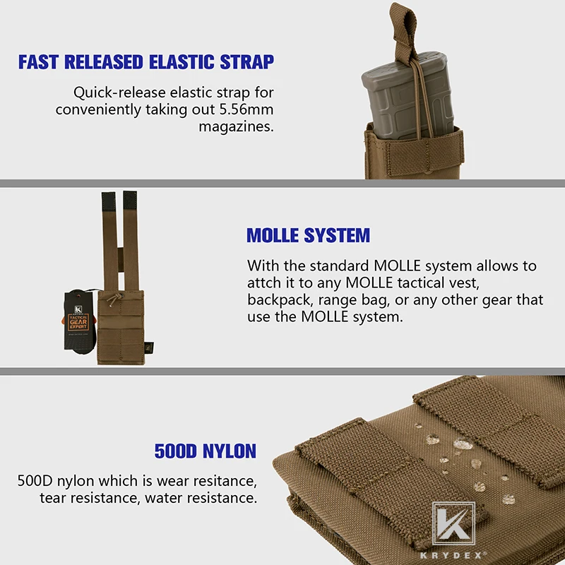 * Material:Tela de nailon MC : US Crye Precision MC Cordura 500D.CB/RG/BK: Tela de nailon Cordura 500D* Diseño modular triple abierto con tiradores de cordón elástico para un fácil acceso a los cargadores.* Capacidad para 1x5,56. 223 revistas.* Correas PALS delanteras para agregar bolsas/accesorios MOLLE adicionales.* Compatible con correas PALS estándar.* Tamaño: 2,5 "* 1" * 5,2"* Color: Marrón Coyote/CB* Marca: KRYDEXContenido del paquete* KRYDEX 5,56 Modular Single Open Top Magazine Pouch * 1 ud.