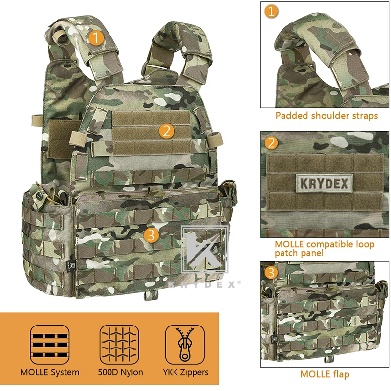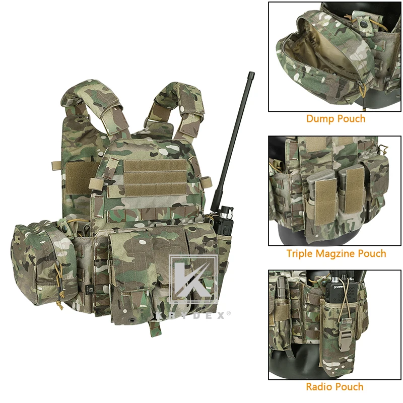 * El chaleco incluye bolsas MAG triples frontales adicionales, bolsa de radio y una bolsa de accesorios (exactamente igual que se muestra en la imagen).* Todas las bolsas pueden ser extraíbles del chaleco.* La bolsa frontal triple MAG se puede ajustar con 5,56. 223 Mags y correas MOLLE en la parte posterior.* Bolsa de radio MBITR con acolchado interior para proteger el dispositivo de impactos con correas MOLLE en la parte posterior, se adapta al tamaño más normal del dispositivo de radio MBITR (la radio ficticia no se incluye solo para mostrar fotos).* Tamaño de la bolsa de accesorios: 23x15x11 cm, correas multifuncionales y MOLLE en la parte posterior.* Los puntos modulares de fijación Web en todo el perfil de los transportistas proporcionan la máxima versatilidad.* Pestañas de liberación rápida en la parte inferior para el ajuste y extracción de la placa delantera y trasera.* Faja para estiba de engranajes y armadura lateral (placas de 6 "x 6" no incluidas) con ajuste trasero de bungee oculto.* Tamaño de la placa de Armadura: tamaño M: 9,5 "x 12,5" o tamaño L: 10,25 "x 13,25". (Placas no incluidas, se venden por separado).* Bolsas de radio laterales interiores duales con retención.* Correas de hombro ajustables y extraíbles con acolchado interior para un uso cómodo.* Guías de cable, antena y manguera de hidratación.* El Bolsillo tipo canguro frontal centrado proporciona un acceso rápido.* Talla única para todos, el tamaño del chaleco puede ser ajustable. Tamaño de la placa de Armadura: tamaño M: 9,5 "x 12,5" o tamaño L: 10,25 "x 13,25".* Color: MC.El paquete incluyeChaleco MOLLE Modular Táctico KRYDEX, 1 Unidad, 1 Unidad