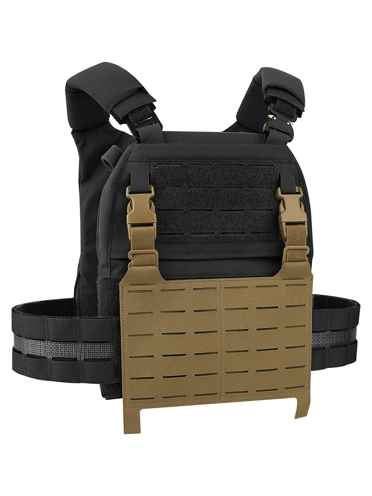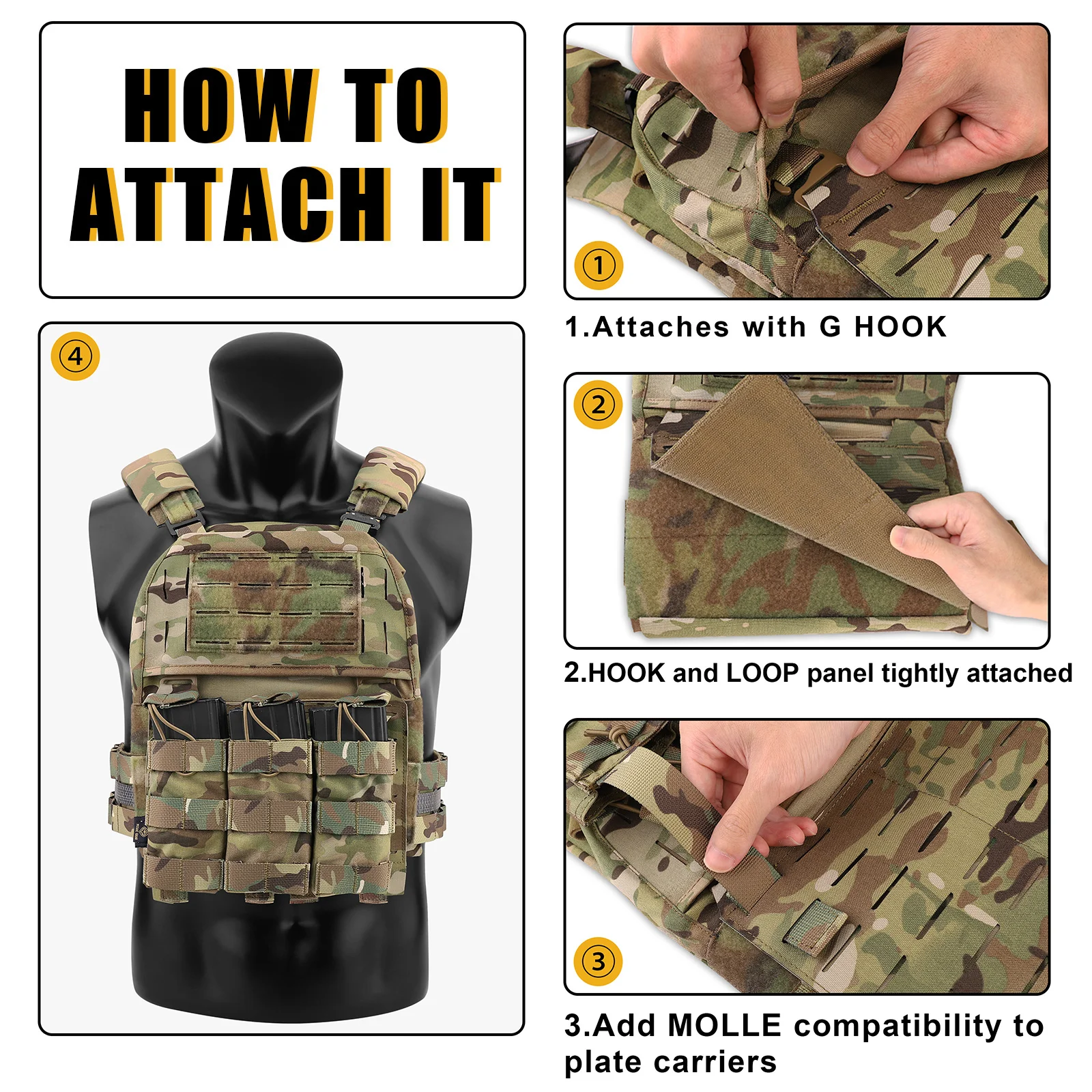 * Panel MOLLE de corte por láser preciso con dos sistemas de adaptación: hebilla de gancho G de 1 pulgada y hebilla de fijación rápida de 1”.