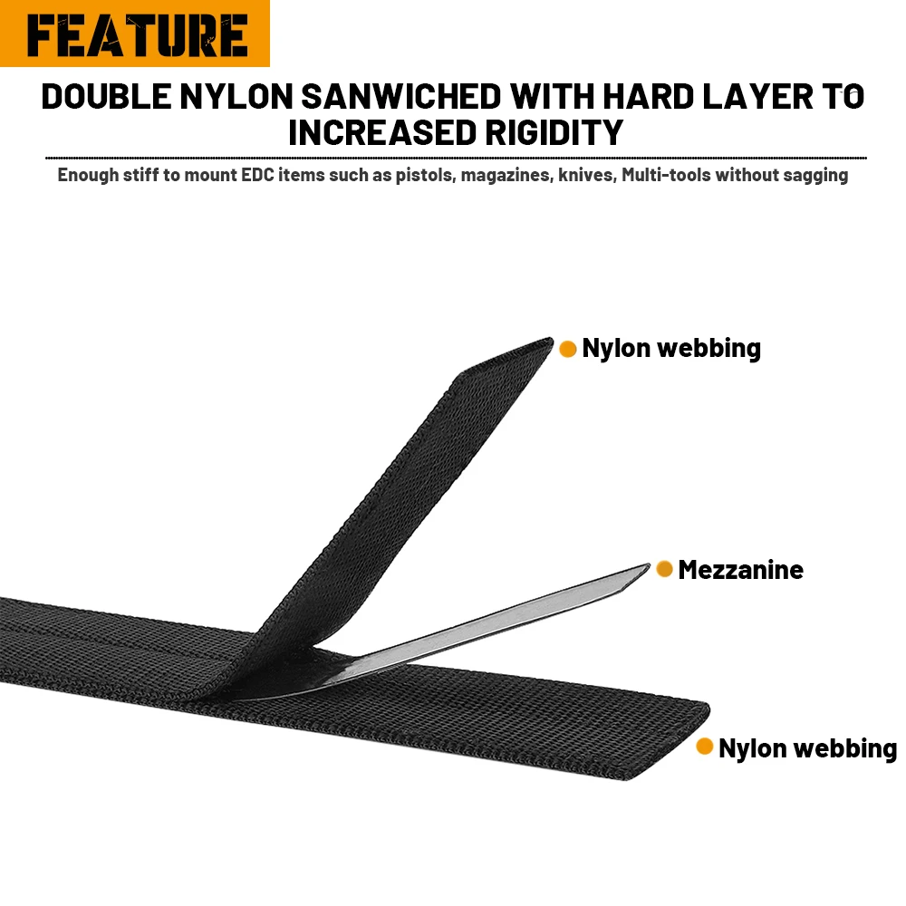 1. Con correas de nailon de 1,5 "resistentes a desgarros de 2 capas rígidas para rigidez y resistencia para soportar fundas/bolsas OWB e IWB sin enrollarse.
