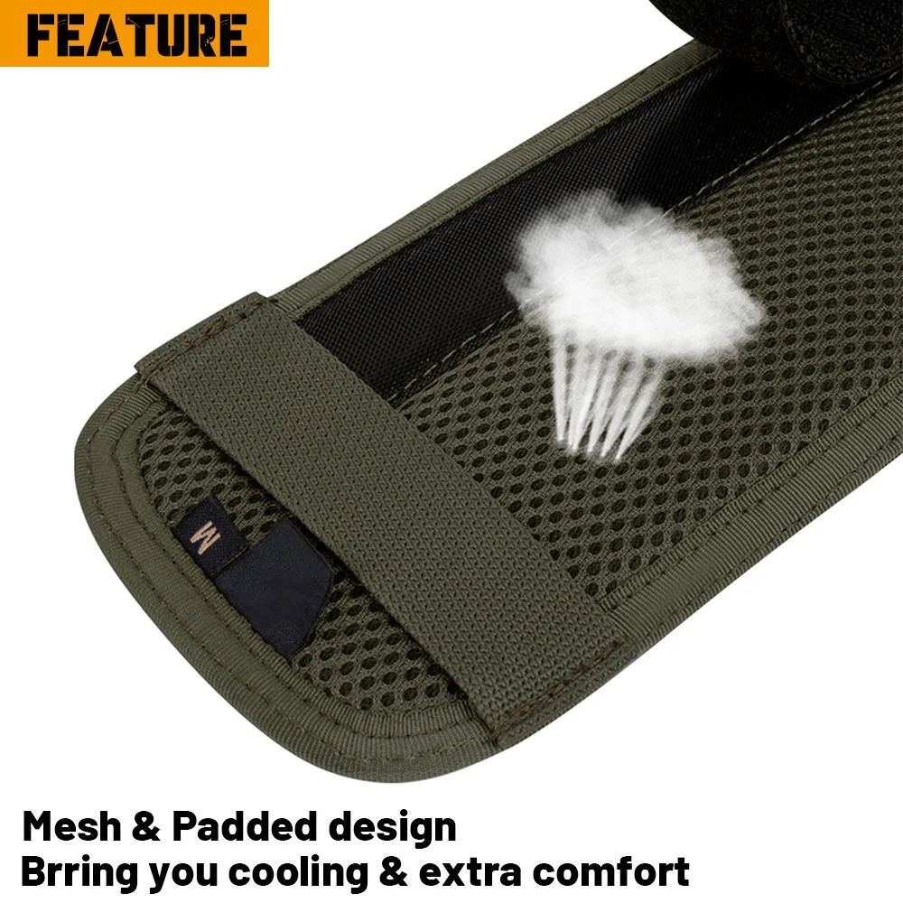 3.Diseño de malla y acolchado para refrigeración y mayor comodidad.Sistema de fijación de gancho de inyección interno que se puede utilizar mediante un cinturón normal con una capa de bucle en el exterior.