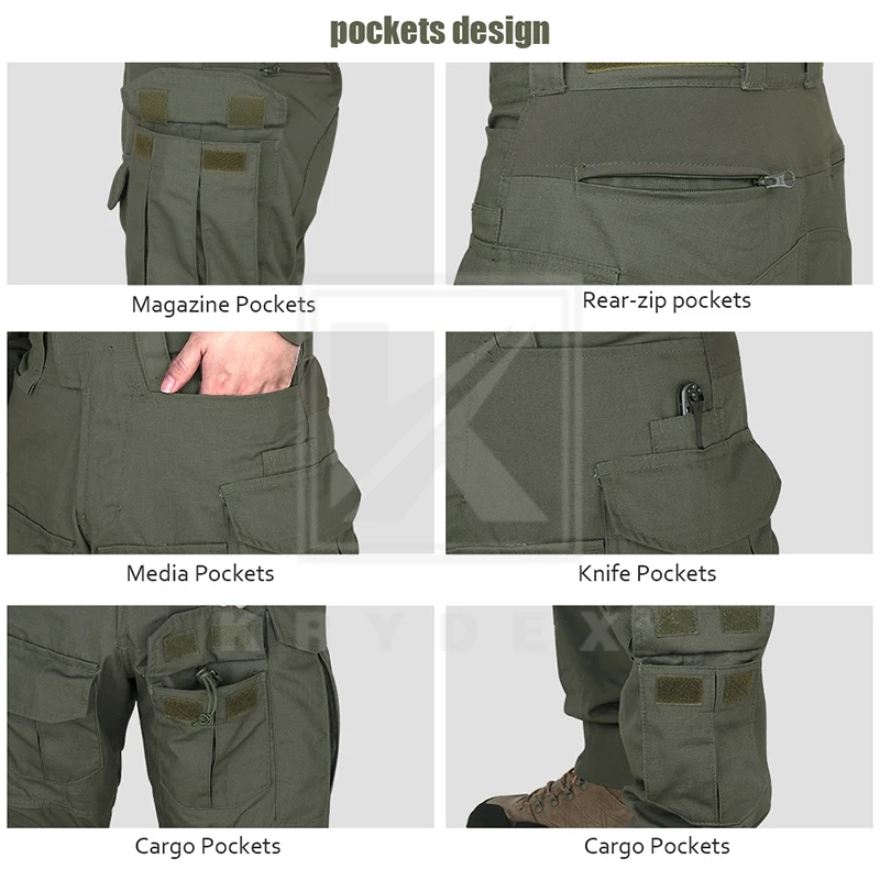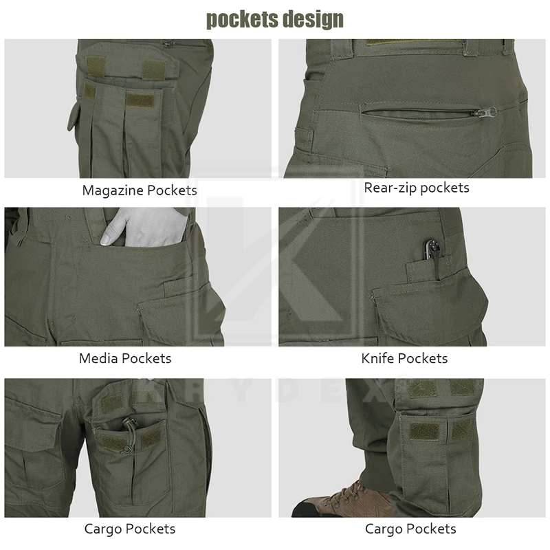 * Material: el contenido de la tela risop es 50% poli 50% Algodón, el contenido de la tela elástica es nailon.* Diseño ergonómico con tejido elástico MC para entrepierna con fuelle de diamante, espalda baja y rodilla.* Sistema único de ajuste de cintura discreto.* 10 bolsillos de diferentes tamaños en los pantalones para un uso conveniente.* Cada bolsillo de carga oculta el estabilizador de botella de agua/Revista.* Soporte dedicado para cuchillo/luz que aún permite el acceso al bolsillo.* Ajustador de altura de rodillera simple ubicado en el bolsillo frontal del muslo.* Diseñado para usar con rodilleras de combate extraíbles (incluidas).* La solapa incorporada cubre la apertura de la rótula cuando no se usan rodilleras.* Bolsillos traseros con cremallera YKK.* Bolsillos delanteros de muslo más grandes.* Asiento de doble capa.* Cierre de gancho y bucle en el tobillo para sellar la grava y la suciedad.* Tamaño disponible de 30 a 40W, consulte la tabla de tallas, si no está seguro de qué tamaño debe comprar, envíenos un mensaje.* Color: Ranger Green/RG.El paquete incluyePantalones tácticos KRYDEX con rodilleras * 1 ud.