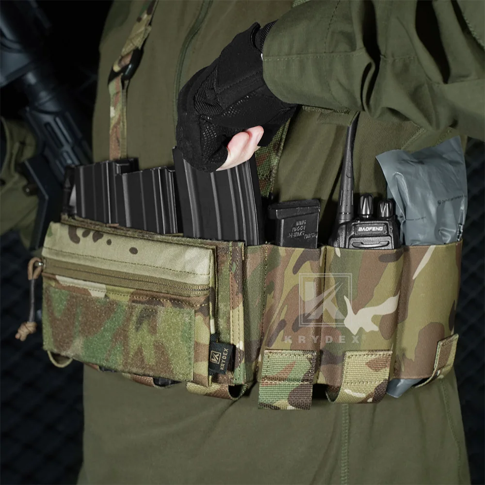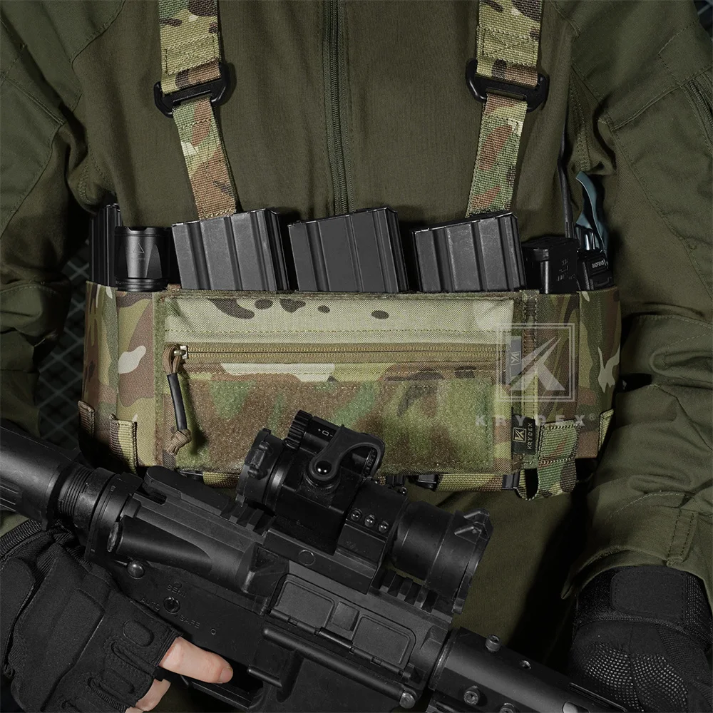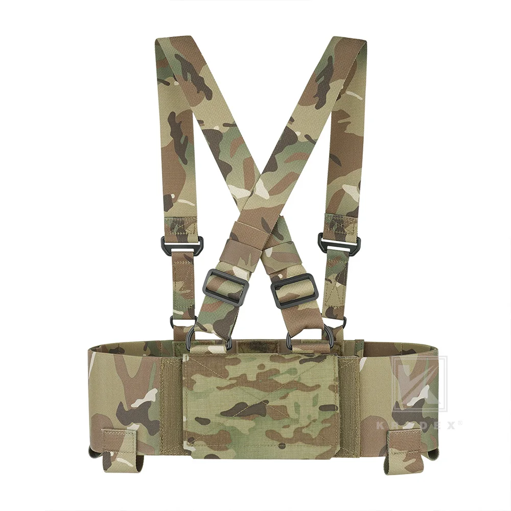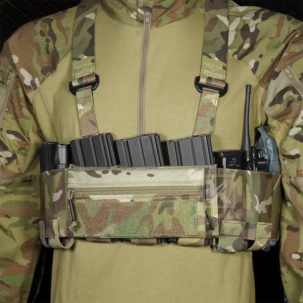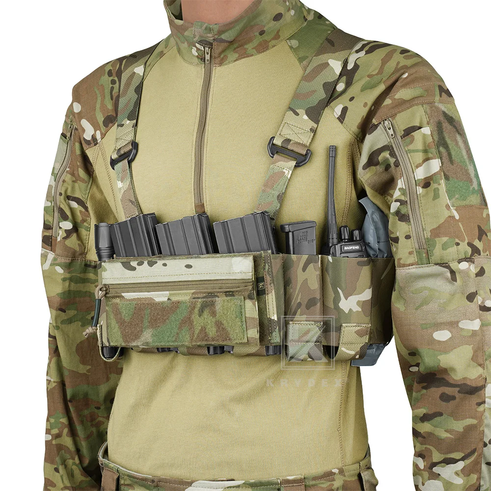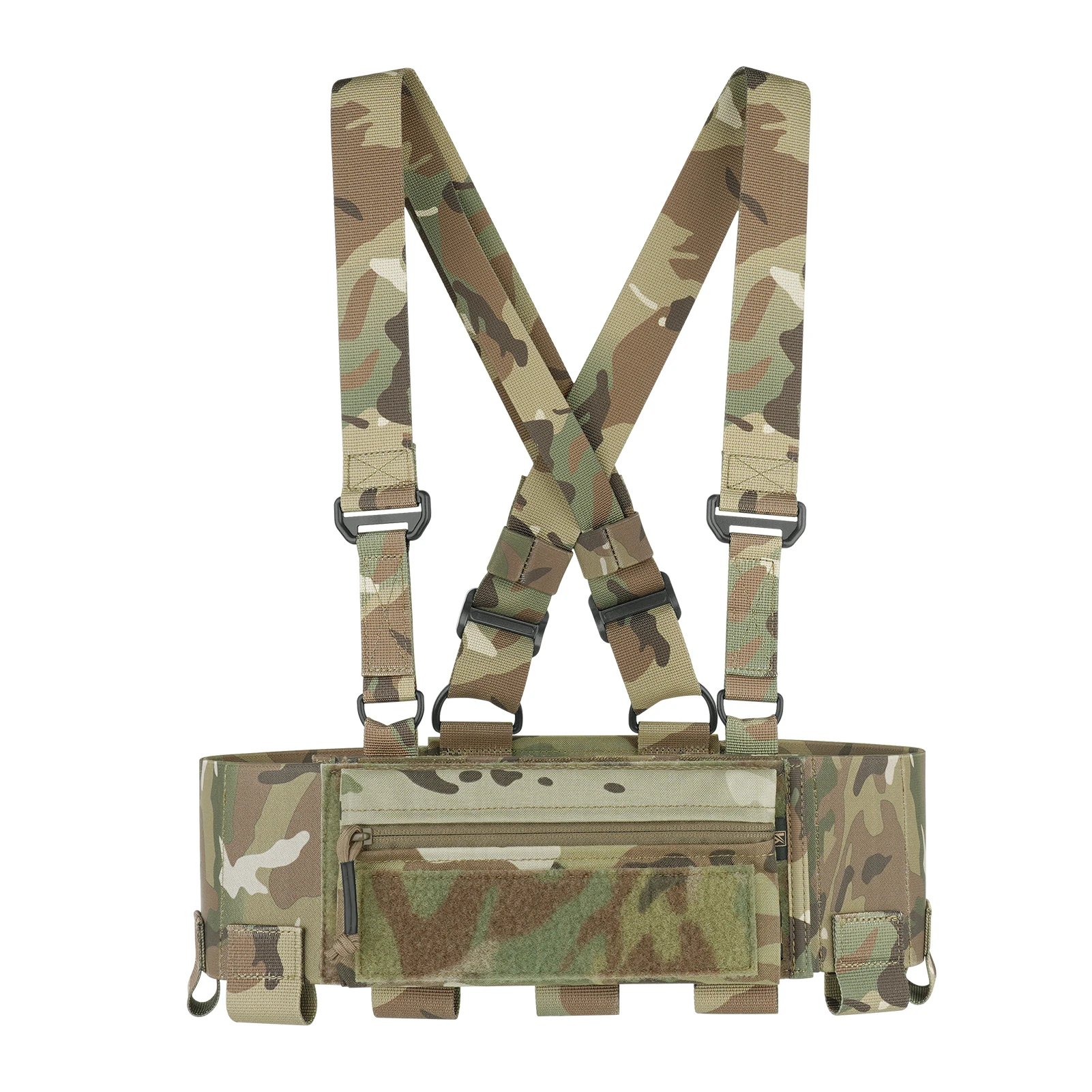* Equipo de pecho de transporte liviano y oculto con arnés en X ajustable y bolsillos elásticos para revistas, herramientas, suministros médicos, radio y otros equipos.