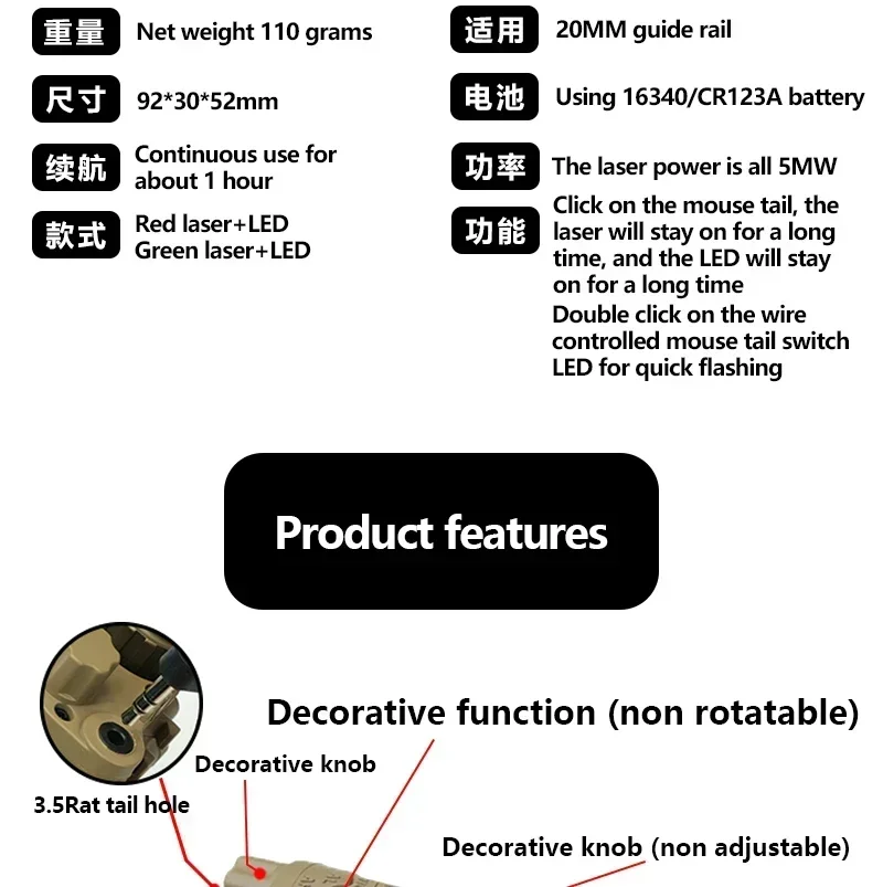 PD: Este cuerpo láser no tiene ninguna función de botón o función de ajuste cero, es solo una función decorativa. Todas las operaciones son controladas por un interruptor de presión, y el láser no se puede ajustar a cero. Si se requiere una función de ajuste cero, no realice un pedido.