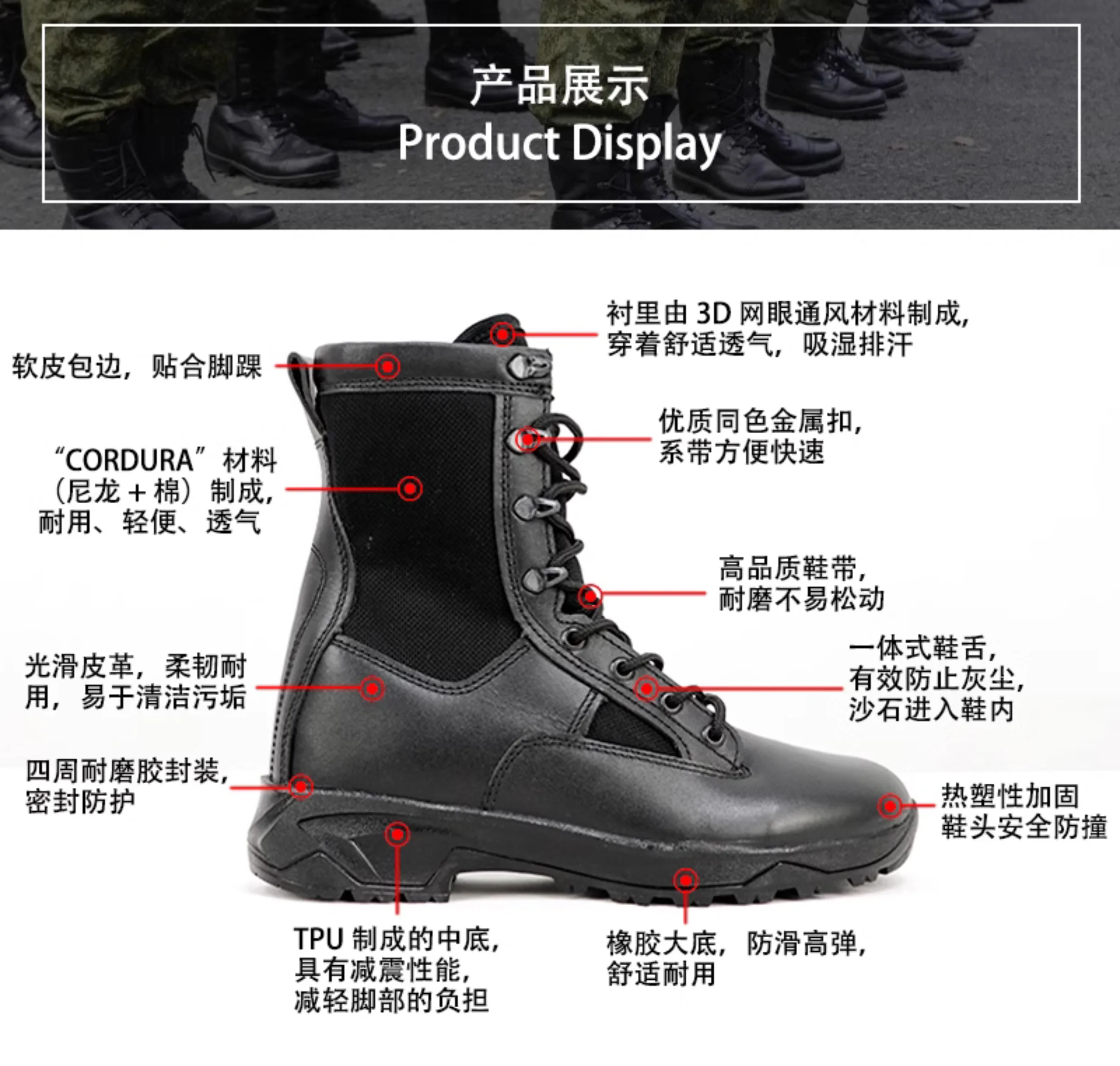 Esta bota es adecuada para estudiantes urbanos en ambientes cálidos y calurosos en primavera, verano y otoño, así como para diversos escenarios de aplicación como combate al aire libre y entrenamiento en campos de entrenamiento.