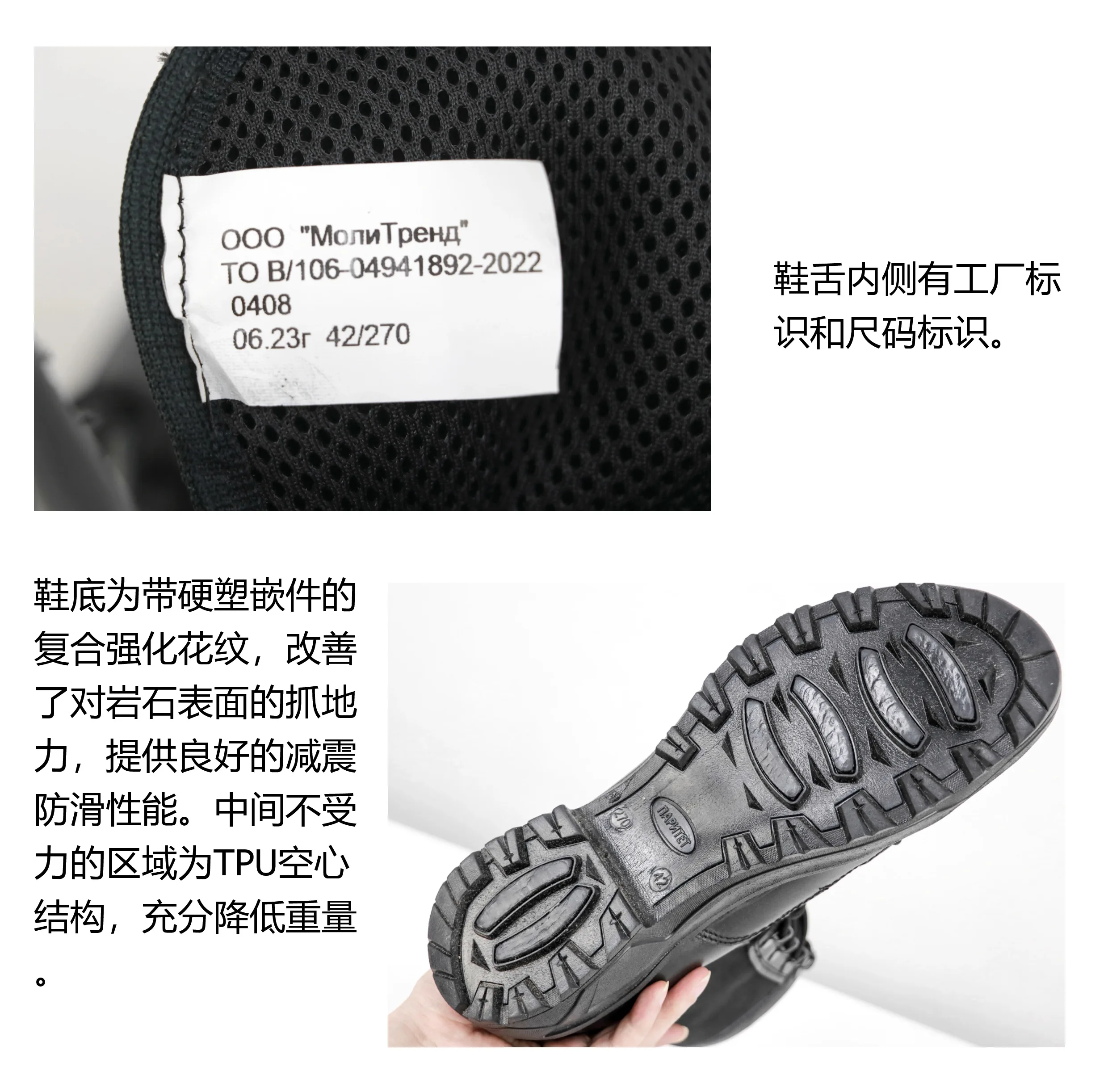 La suela está fabricada en elastómero termoplástico TPE.Puede soportar temperaturas que oscilan entre -40℃ a +40℃.La adopción firme del método fijo (vulcanización por estampado) para moldeo por compresión proporciona mayor resistencia y resistencia a la humedad.