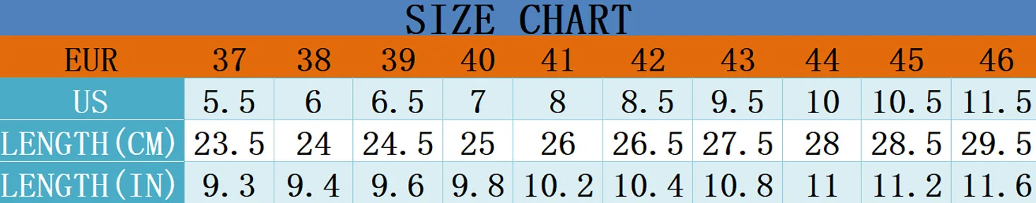 1. Las medidas son el tamaño máximo, permita un error de aproximadamente ± 5MM.Compare la tabla de tallas con la longitud de sus pies cuidadosamente antes de realizar el pedido.