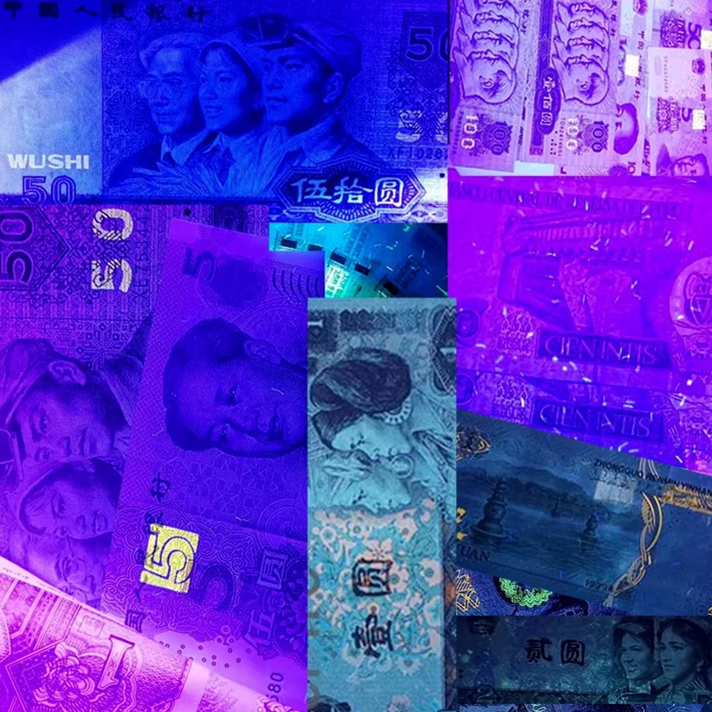 Una linterna de luz violeta de 365 nm puede emitir algo de fluorescencia que no puede ser detectada por una linterna de luz violeta de 395 nm, como la fluorescencia en la parte posterior del yuan chino. En resumen, la luz violeta de 365 nm es adecuada para la inspección de billetes antiguos, identificación antifalsificación y el secado con pegamento UV. La luz violeta 395 es adecuada para la pesca al aire libre, el observación de visión nocturna con fluorescencia de boyas o la iluminación de lámparas de escorpión.