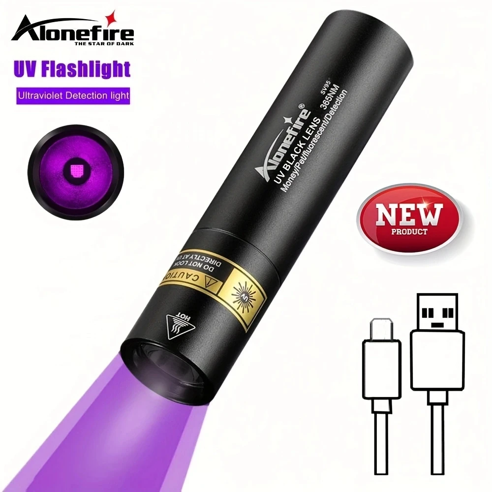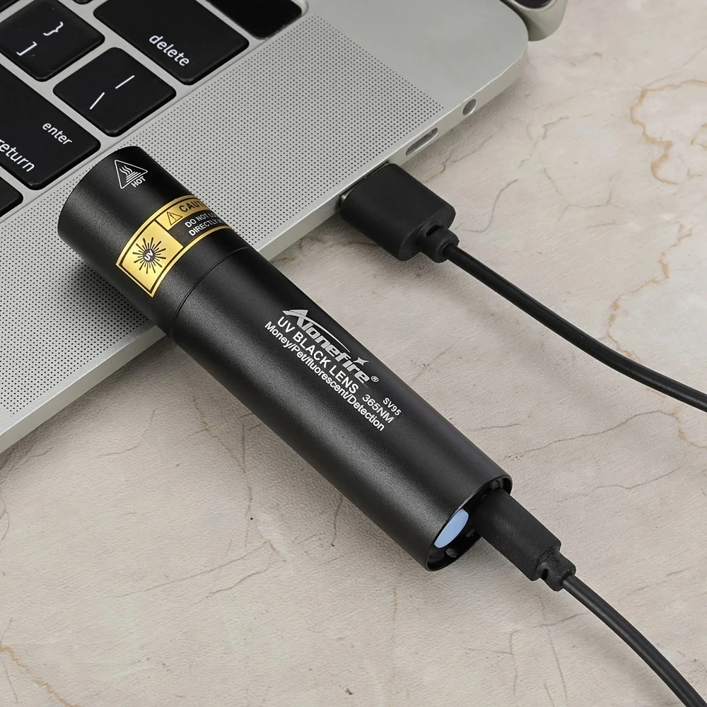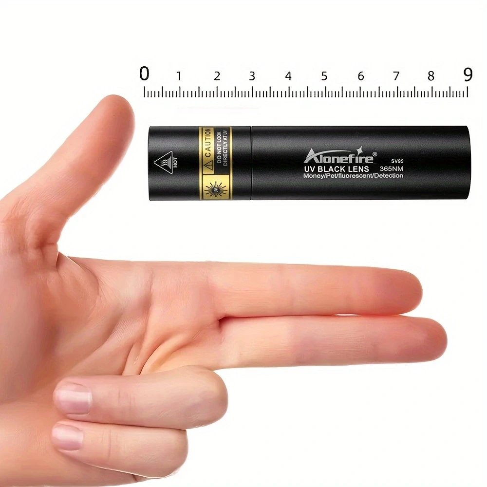 Especificaciones: 1.Marca: Alonefire 2.Modelo de producto: SV95 3.Material: aleación de aluminio 4.LED: 1 unidad LED ultravioleta de 365 nm 5.1 modos: alto 6.Batería: batería de litio incorporada 7.Método de carga: CARGA USB 8.Resistente al agua: solo a prueba de salpicaduras 9.Peso: 52 g/0,11 libras 10.Tamaño: 90 mm/3,54 pulgadas (largo) x 21 mm/0,83 pulgadas (cabeza) x 21 mm/0,83 pulgadas (cola)