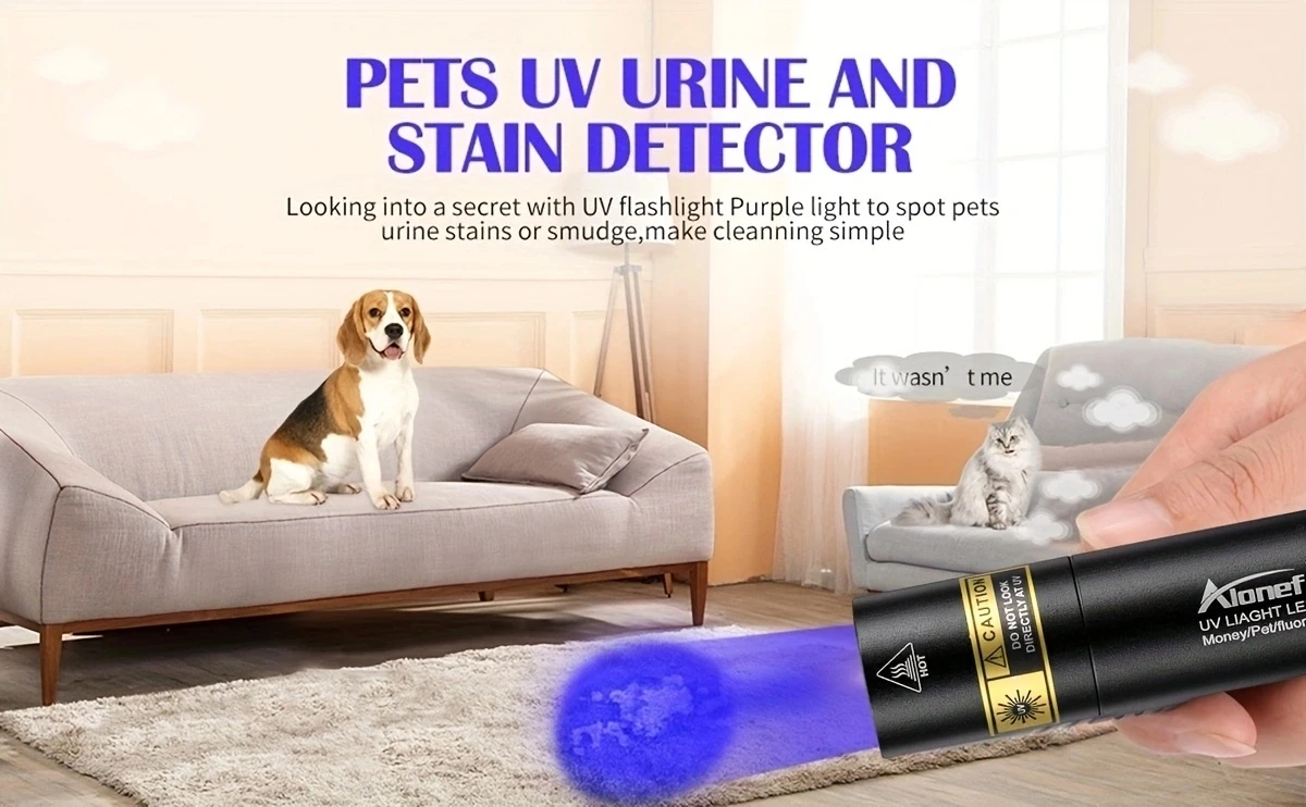 LINTERNA AZUL UV La linterna ultravioleta se puede utilizar como detector de orina para mascotas (perros/gatos)/buscador de escorpiones/fluorescente/detector/moneda/licencia/tarjeta/pasaporte authentifico. (En un ambiente oscuro, ¡el efecto de detección de luz violeta UV es mejor!)