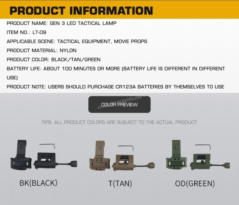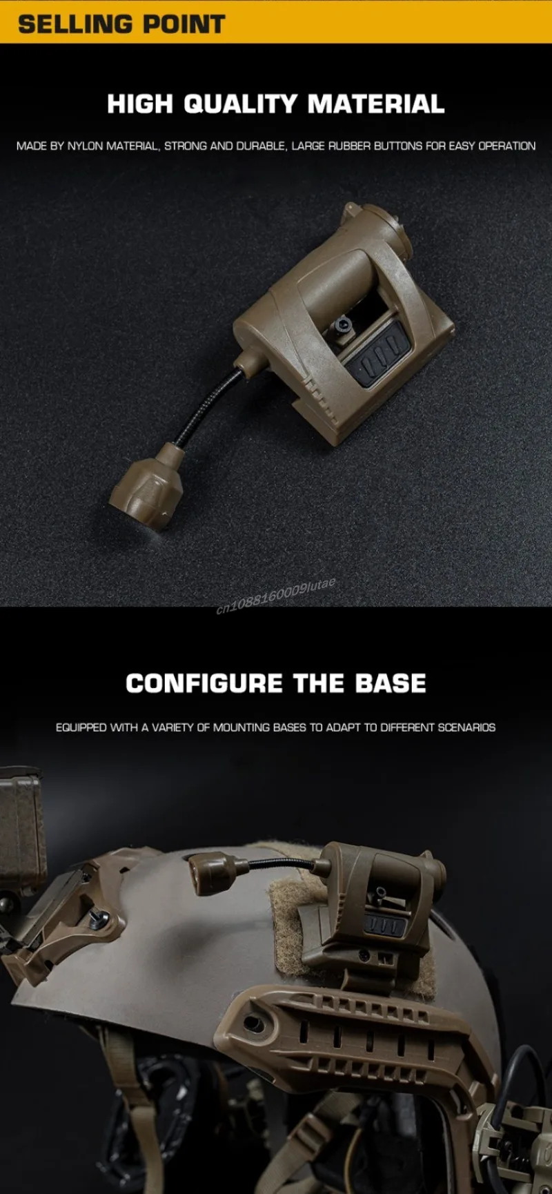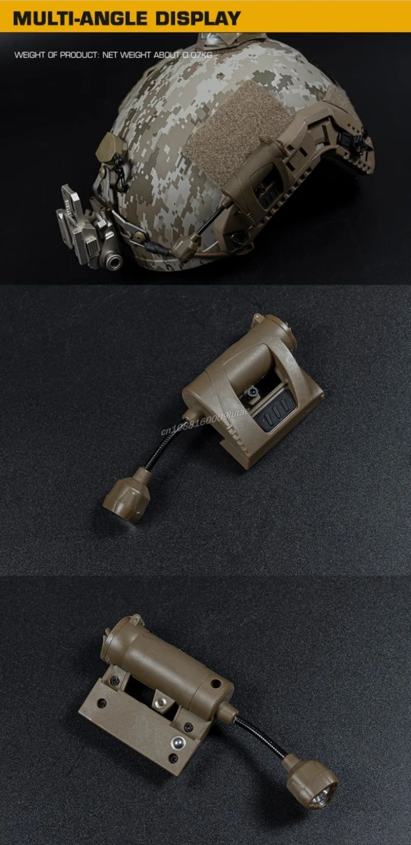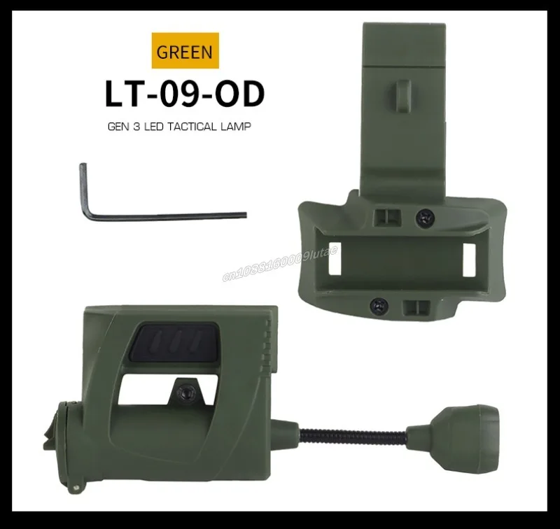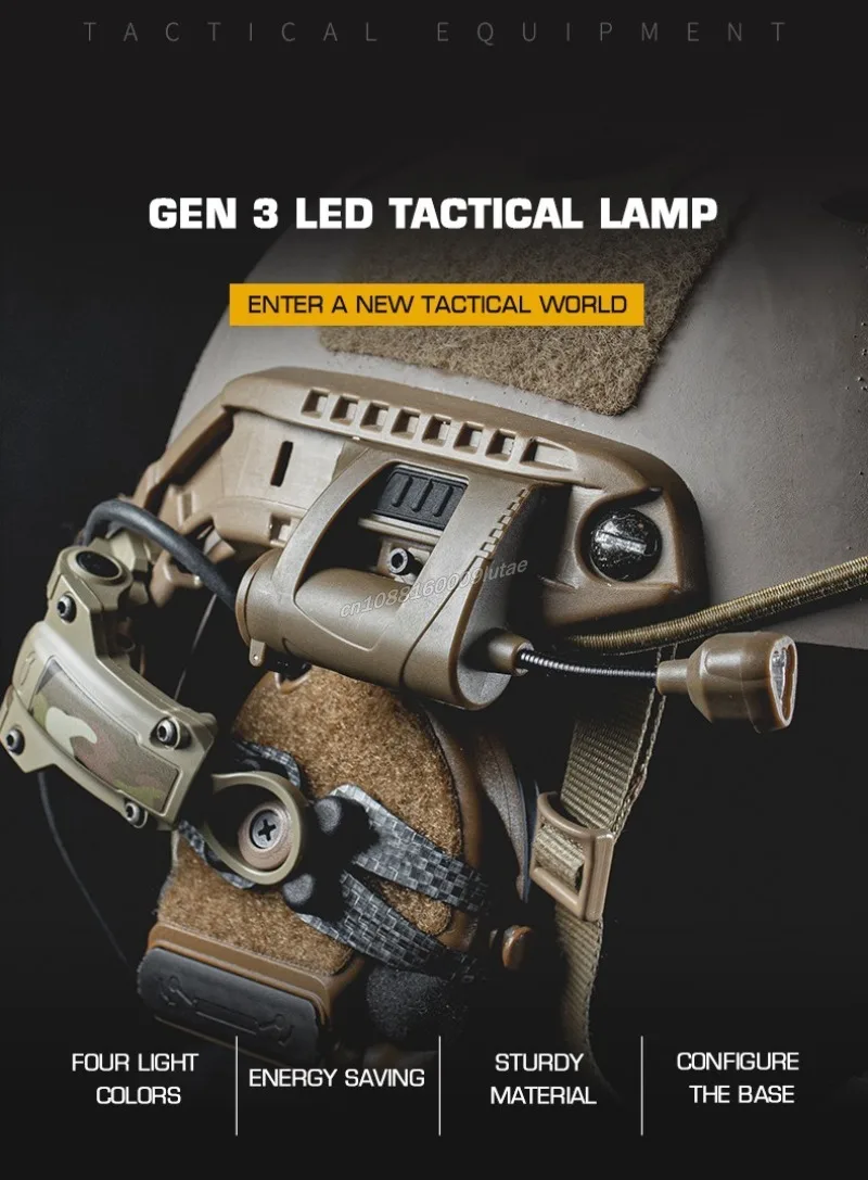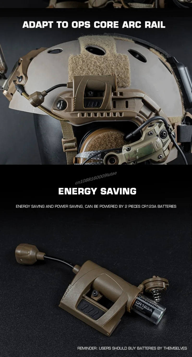 Característica:1. Montaje lateral del casco.El producto está equipado con un clip y un adaptador de montaje en riel ARC para que pueda adaptarse a diferentes cascos tácticos.