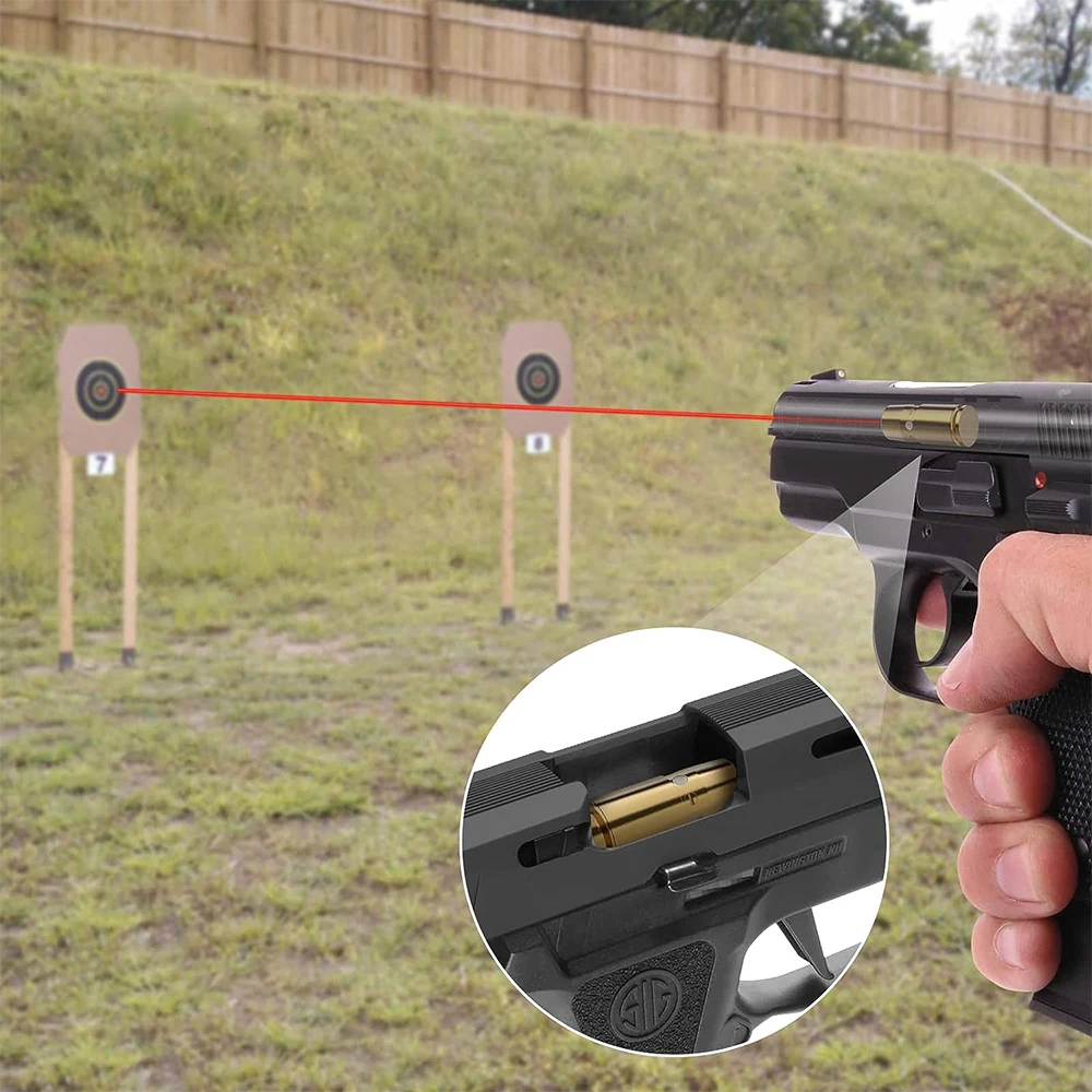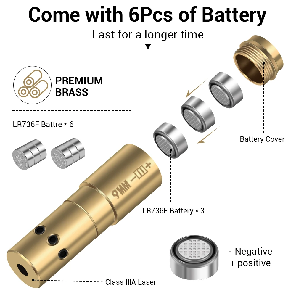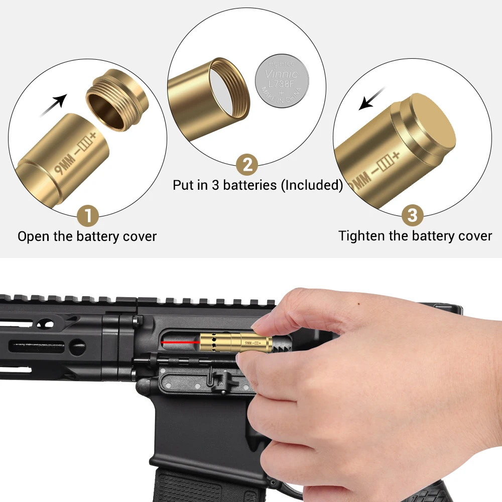 5.【STRURDY DURABLE】The laser bore sight is made of sturdy and durable brass construction, light and compact size, sit perfectly in the bore, it adapt to various bad environments.How to use the bore sight?1.Unscrew the back cap from the bore sight by turning counterclockwise.2.Stand the bore sight on a flat surface with the laser side pointing down.3.Insert batteries inside the rear opening.4.Carefully push down and turn the screw cap clockwise to tighten the cap (the laser is now on).5.Place in your rifle’s chamber and close the bolt.6.To remove - open the bolt if it does not automatically extract, manually remove the unit by tilting the rifle’s barrel upward (always practicing safe firearm practices).