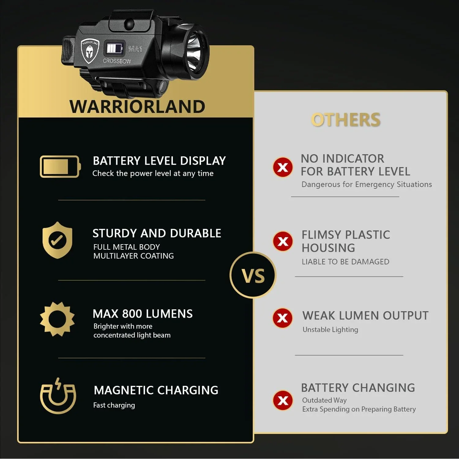 Funda Glock 17/19 OWB Kydex Mano derecha: Funda Kydex hecha a medida para candado G 17/19 con MA1 incluida en la caja para transporte abierto, solo dibujo a mano derecha. WARRIORLAND CROSSBOW MA1: Luz de pistola universal con pantalla de estado de batería y modo de luz para mejorar la preparación en condiciones de poca luz.Combinación de alto brillo y láser verde: ilumina hasta 137 metros con 800 lúmenes. Información del láser: Clase del láser: Clase IIIa Láser; Potencia de salida: Menos de 5 mW; Distancia del láser: 50 pies; Longitud de onda del láser: 510-530 nm Construcción sólida y de precisión: fabricada con aluminio mecanizado anodizado y luz universal para pistola. Compatibilidad universal: compatible con la mayoría de pistolas equipadas con rieles y suministrado con 6 llaves diferentes para una fácil fijación a varias pistolas. Ideal para usar como luz de pistola universal con montaje en riel.