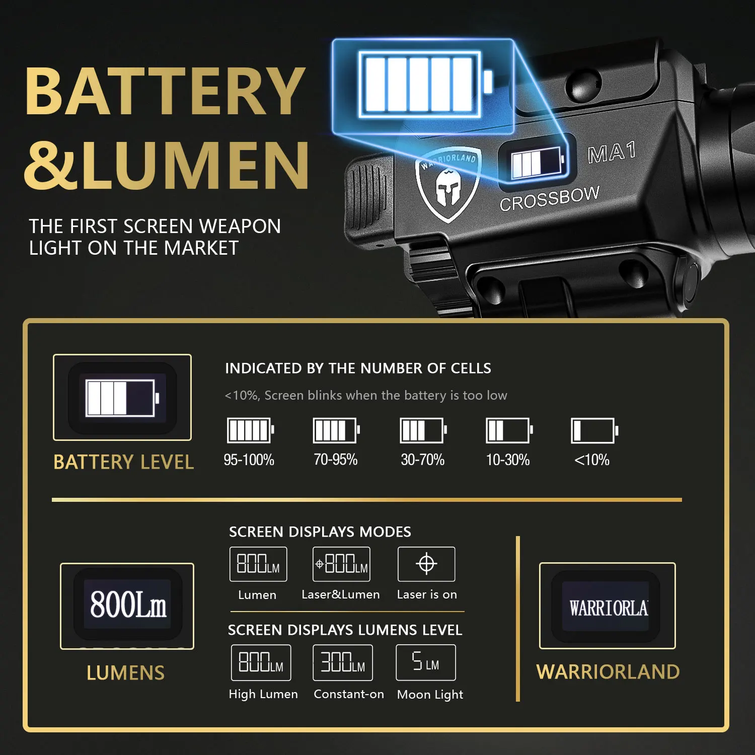 La luz de arma de primera pantalla del mercado: WARRIORLAND CROSSBOW MA1 es una luz de arma de montaje en riel universal.La pantalla puede mostrar el estado de la batería y el modo de luz actual y eso significa que sabes exactamente cuánta energía queda y qué modo se selecciona incluso en entornos de oscuridad total y prepárate para cualquier situación.