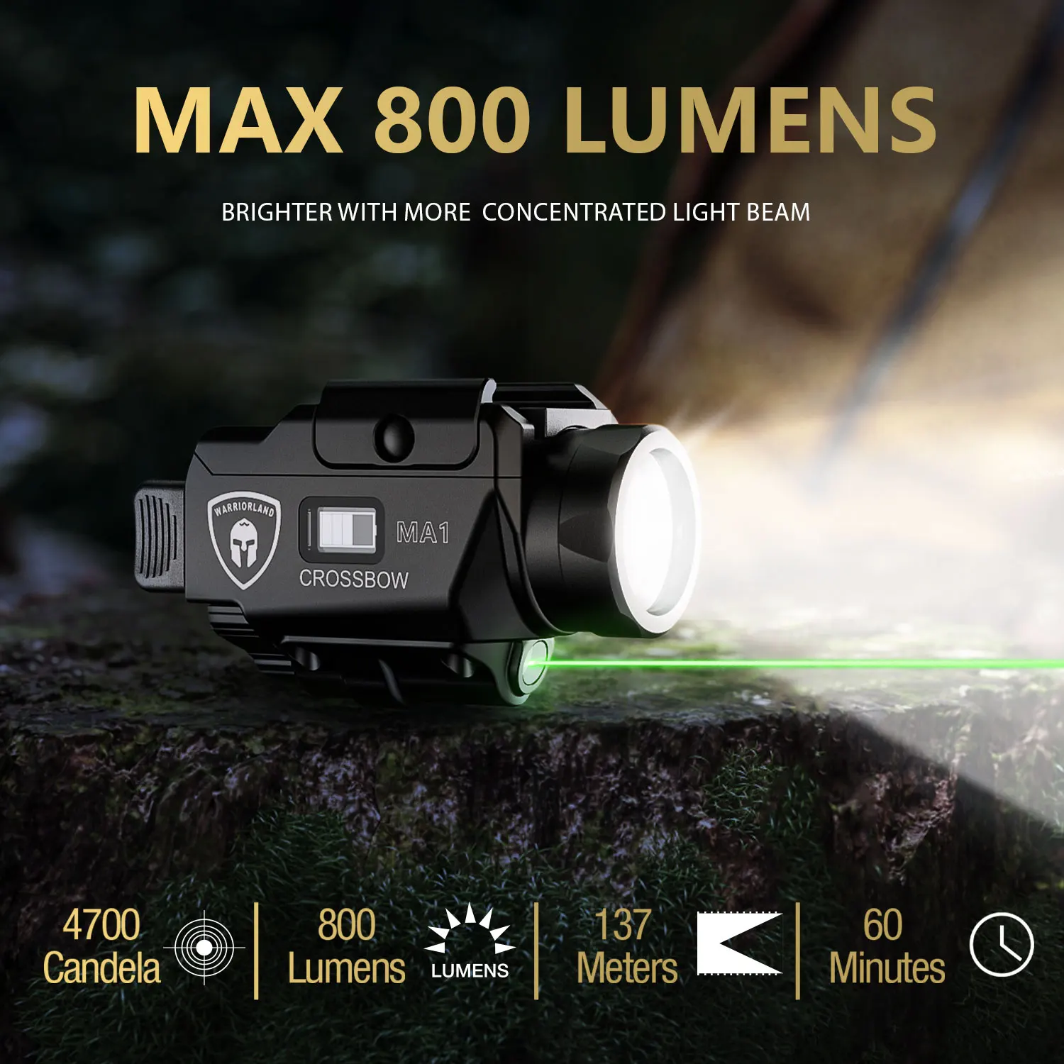 Combinación de alto brillo y láser verde: la linterna WARRIORLAND ofrece hasta 800 lúmenes y alcanza hasta 137 metros de distancia.El láser verde de longitud de onda de 510-530 nm funciona hasta 15 horas.