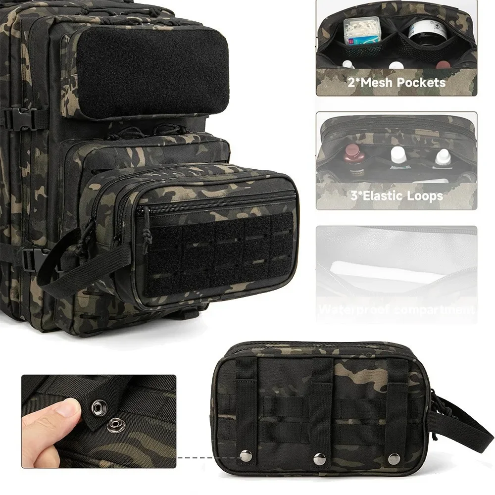 Diseño versátil: la bolsa de higiene cuenta con un práctico asa de transporte lateral y un diseño MOLLE en el bolsillo frontal, lo que le permite colocar pequeñas bolsas, bolsas para botellas de agua y accesorios.Las tres correas verticales y el broche de metal en la parte posterior le permiten agregar la bolsa a una mochila táctica u otros equipos tácticos como una bolsa exterior adicional.