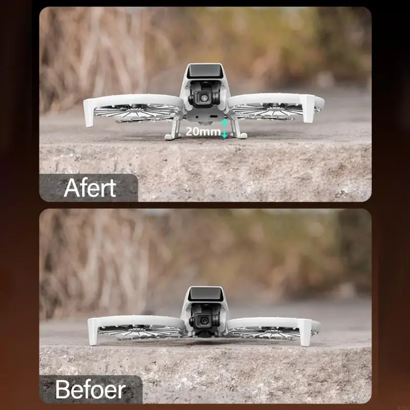 Combined with a height increasing tripod design, can raise the distance between the bottom of and the ground by 20 millimeters. It can reduce the impact force during landing, while avoiding ground debris or stain from dirtying or damaging the body and propeller.