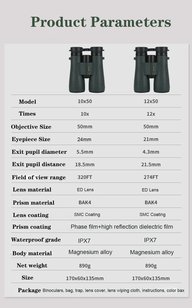 Lente ED profesional 10X50/12X50 binoculares altamente reflectantes SMC IPX7 impermeable Bak4 telescopio óptico baja dispersión para caza