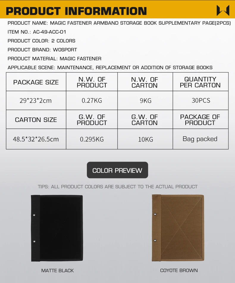 Libro de almacenamiento de brazalete mágico de bucle de doble cara Página complementaria 2PCSInformación del producto Nombre del producto: Página complementaria del libro de almacenamiento del brazalete del sujetador mágico (2 piezas) Artículo No.: AC-49-ACC-01 Color del producto: 2 colores Marca del producto: WOSPORT Material del producto: sujetador mágico Escena aplicable: mantenimiento, reemplazo o adición de libros de almacenamiento.