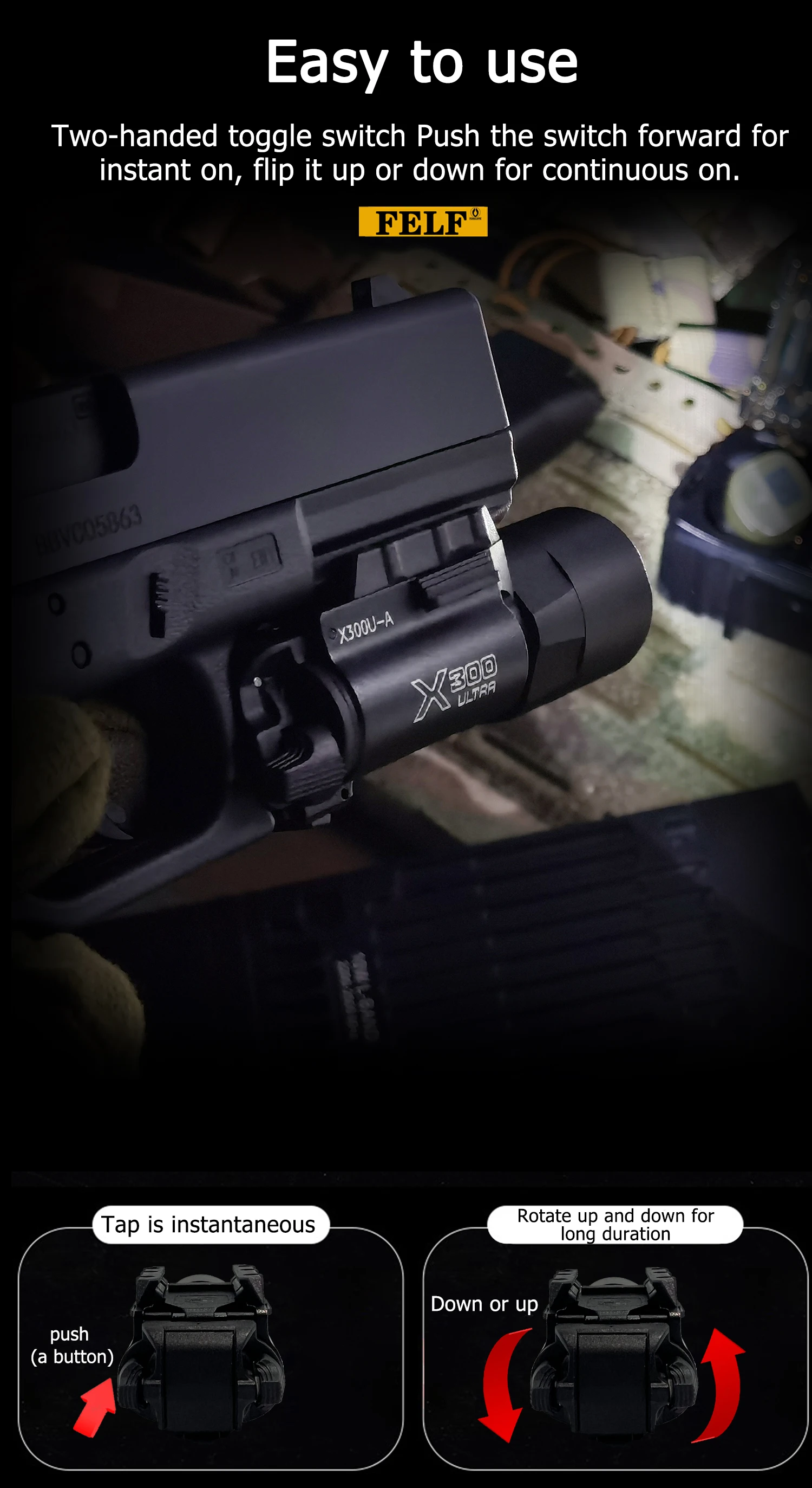 -Interruptor de palanca de dos manos, empuje el interruptor hacia adelante para un encendido instantáneo, gire hacia arriba o hacia abajo para un encendido continuo