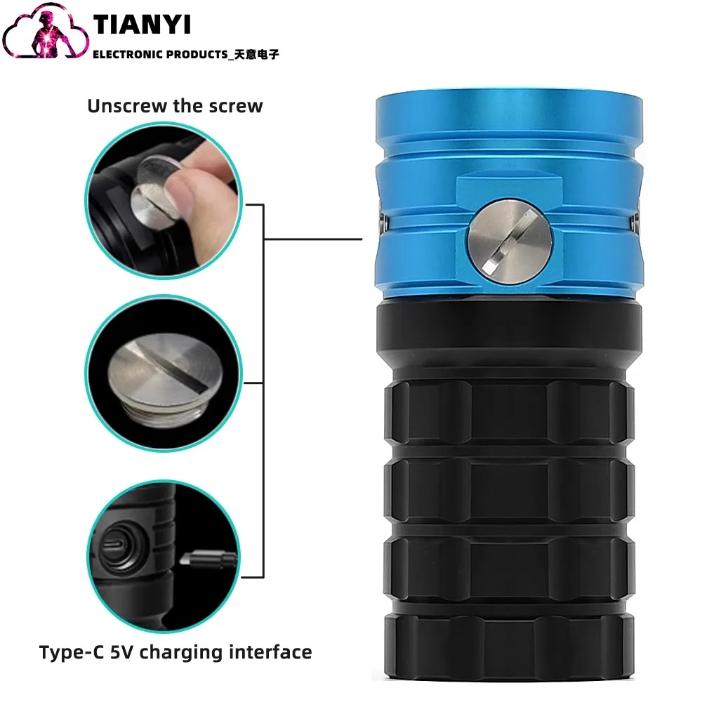 Desenrosque el tornillo, puede usar el cargador de teléfono móvil de 5V para cargar la linterna. Durante el proceso de carga, el indicador del interruptor se muestra en rojo. Después de que la batería esté completamente cargada, el indicador del interruptor se vuelve azul. Antes de bucear, apriete el tornillo del orificio de carga para evitar la entrada de agua.
