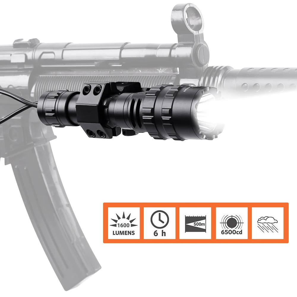 La linterna LED está hecha de aleación de aluminio de grado aeronáutico T6061 con acabado mate anodizado negro, lo que la hace duradera, antiabrasiva y a prueba de golpes. La linterna Picatinny tiene juntas tóricas impermeables selladas en ambos extremos, por lo que se puede utilizar en días lluviosos.