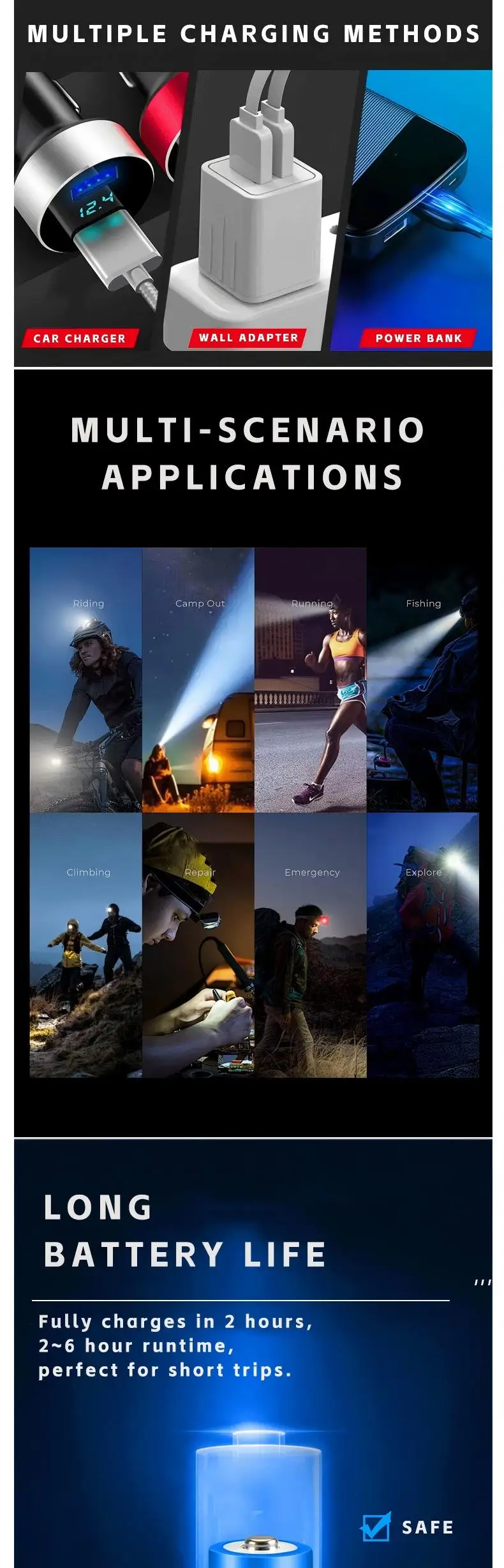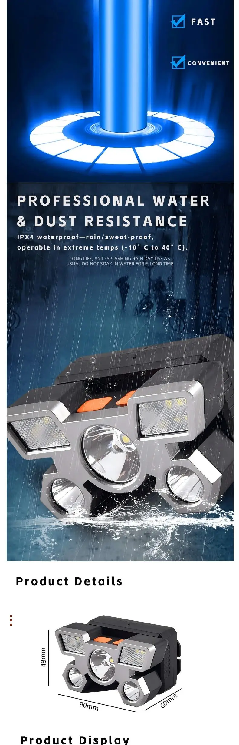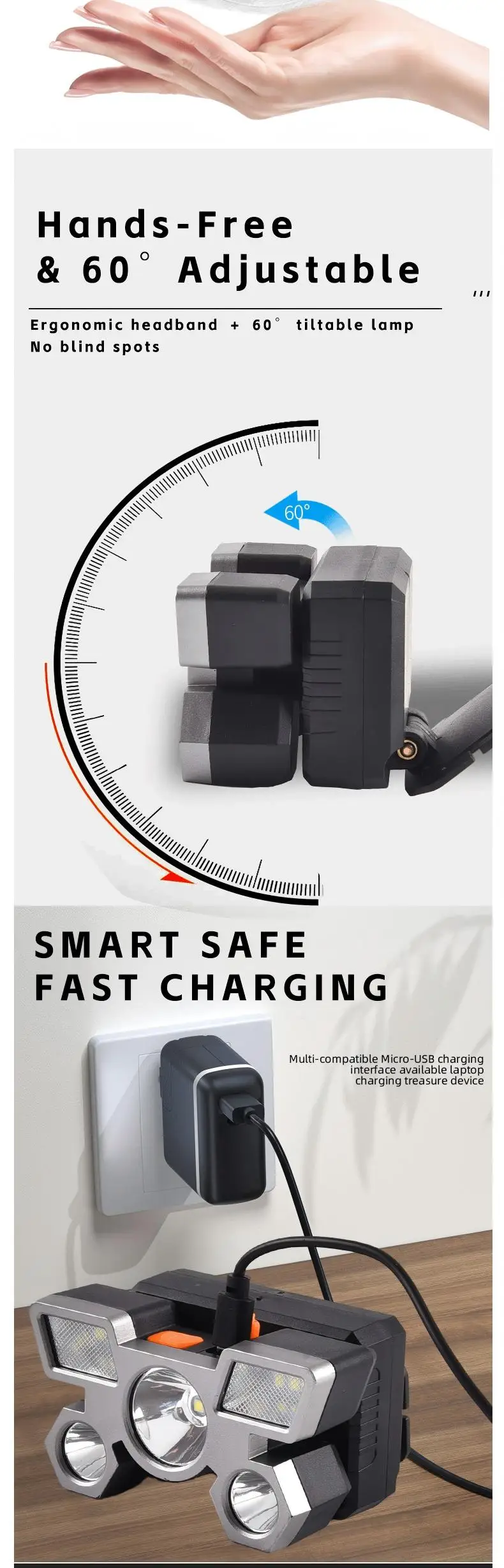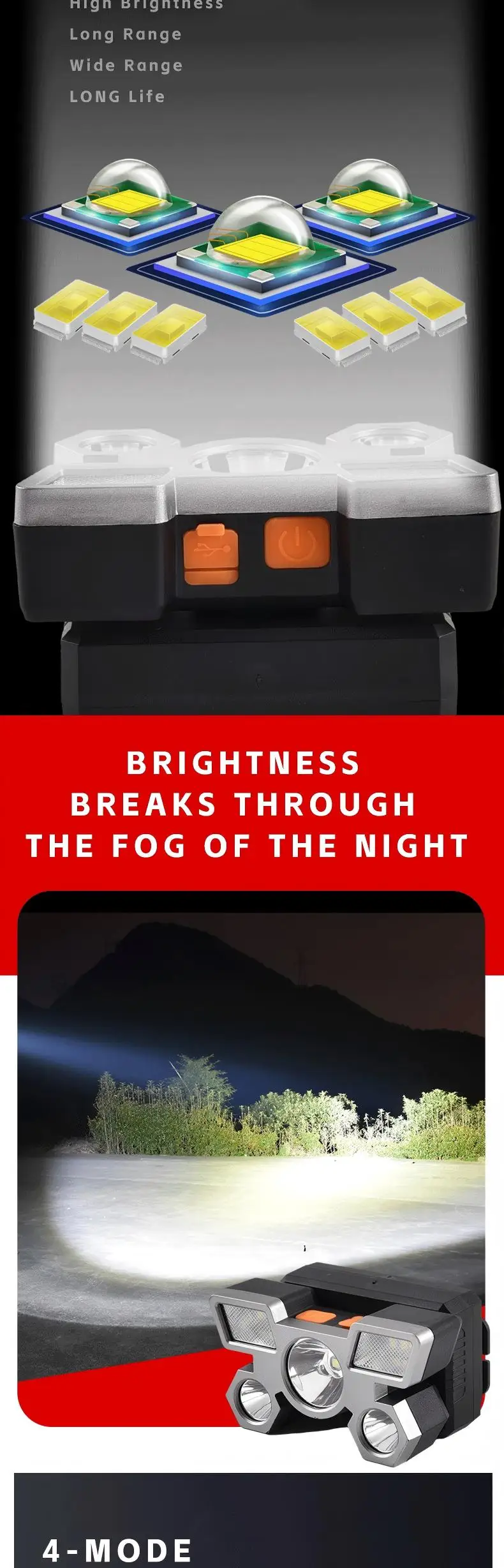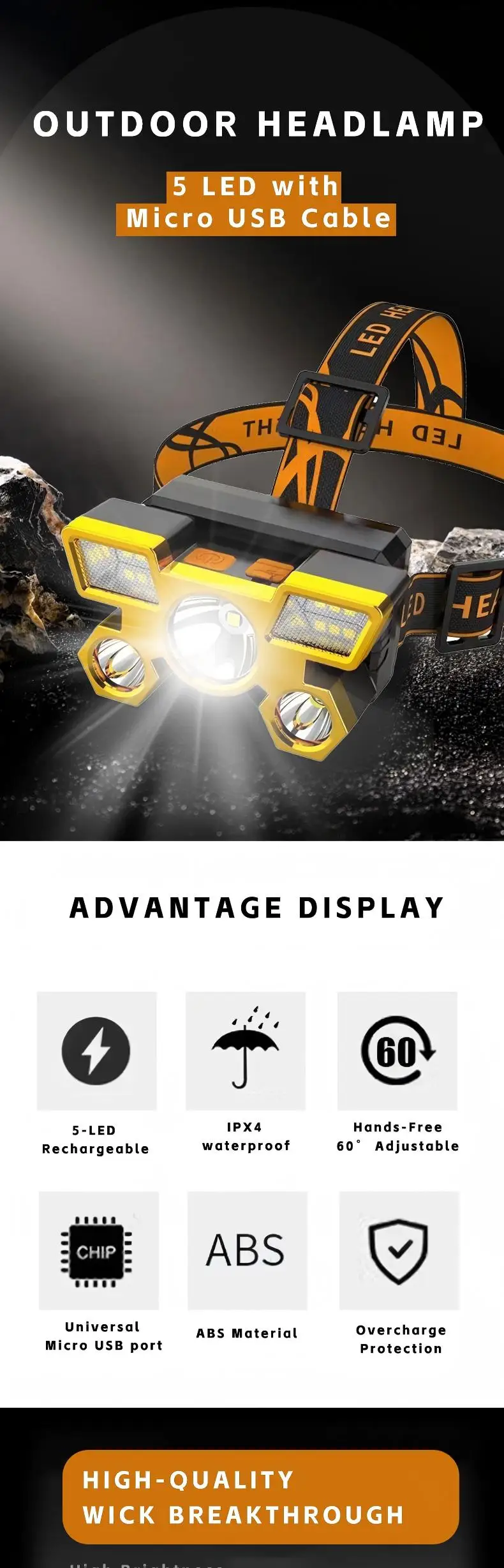 🚀 Linterna frontal recargable por USB de 5 LED| 4 modos de iluminación| Haz de 200 m| Admite carga pasante