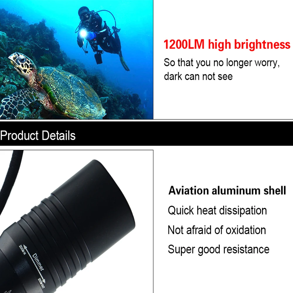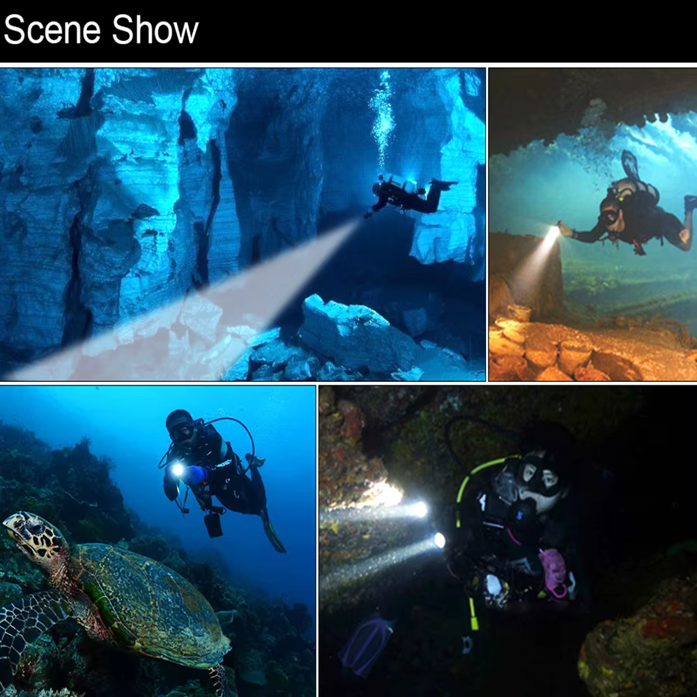 3 modos de iluminación y fácil de usar: - Presione el botón con la mano para encender/apagar la luz. - Presione dos veces el botón para cambiar al modo alto/bajo/estroboscópico. - Mueva el cabezal de la lámpara hacia la derecha para cambiar el modo de foco. - Skecha el cabezal de la lámpara hacia la izquierda para cambiar al modo de inundación. - Ajuste fácilmente el brillo y el modo bajo el agua según su entorno. - Encienda su linterna antes de bucear.