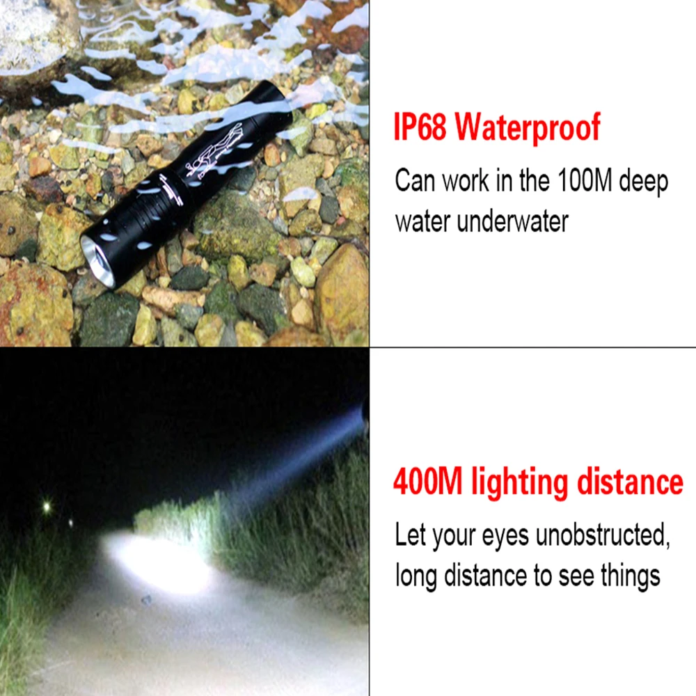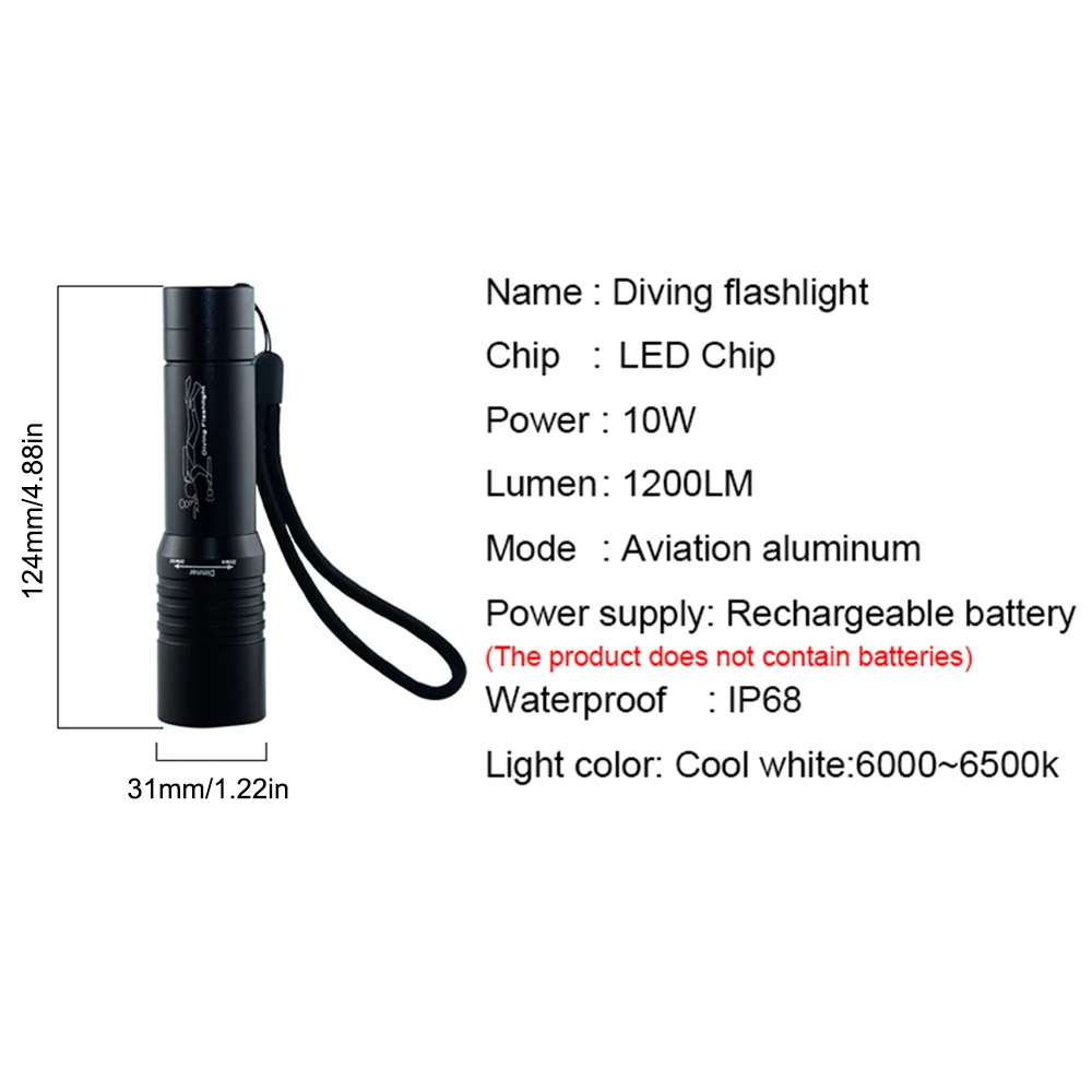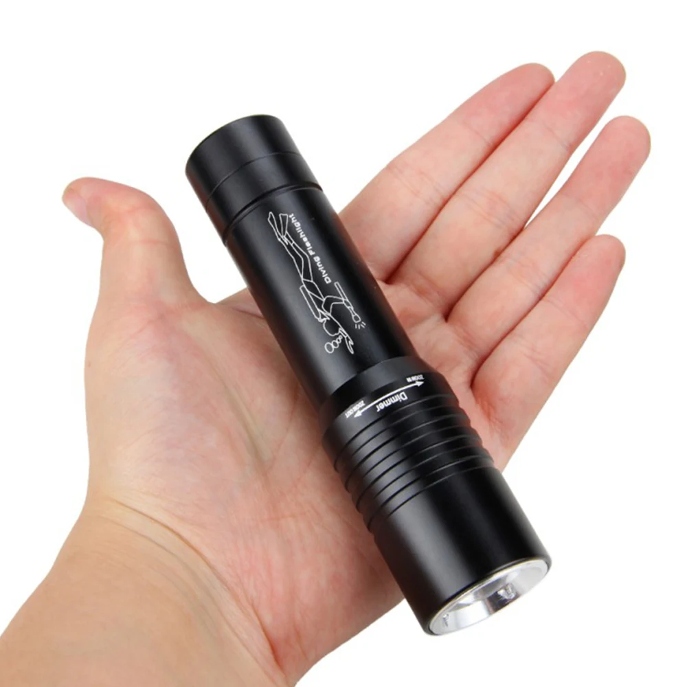 Características: - Adecuado para buceo recreativo, senderismo, camping, mochilero y otras escenas, una linterna confiable. - Distancia focal ajustable, fácil de cambiar el modo de inundación.Hace que la antorcha de buceo sea más práctica e interesante. - Doble junta tórica impermeable, carcasa de aleación de aluminio 6061 y vidrio templado, rápida disipación del calor, fuerte. - Haz estrecho, fuente de luz fría, haz de luz brillante y estable, crean un efecto de luz diurna blanca bajo el agua. - Tamaño pequeño, con correa para la muñeca, fácil de llevar.