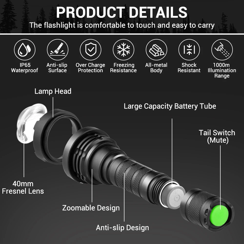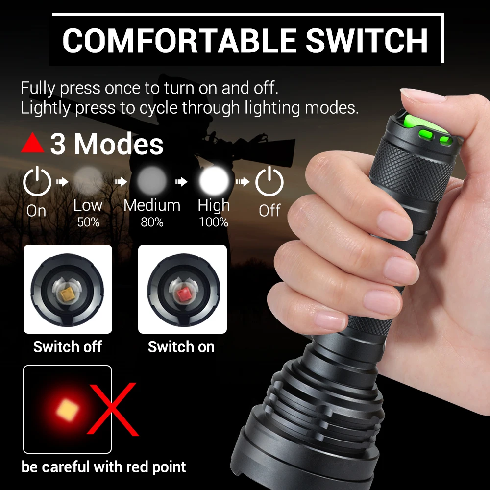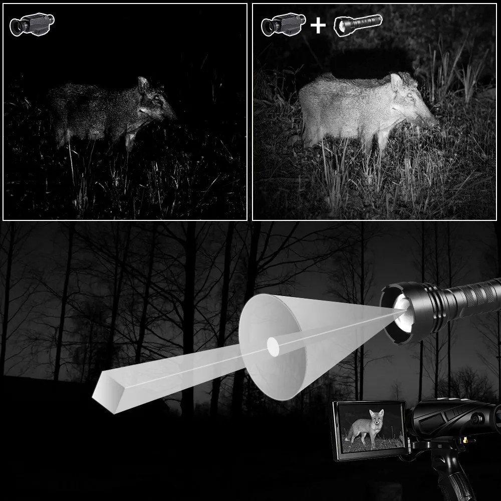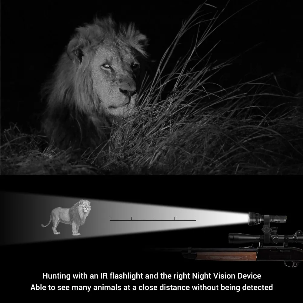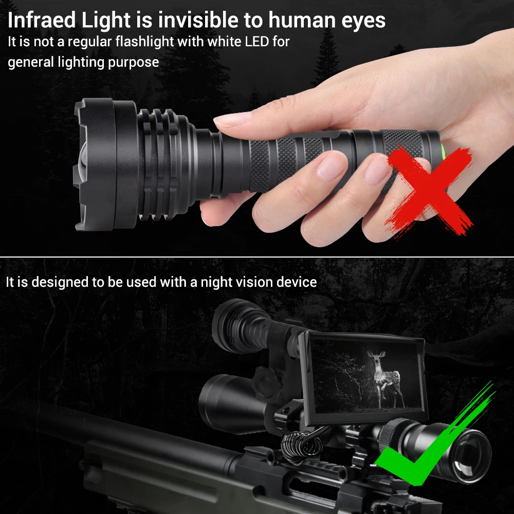 Emite luz infrarroja CSCEL con longitud de onda de 850 nm/940 nm.Se utiliza para observación nocturna, tiro y caza.Debe usarse con herramientas profesionales y adecuadas, como visores de versión nocturna, gafas, NVS, teléfonos con cámara, monoculares y cámaras que no bloquean la luz infrarroja.