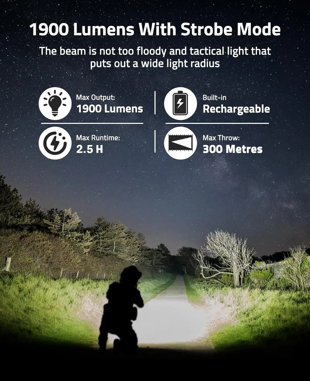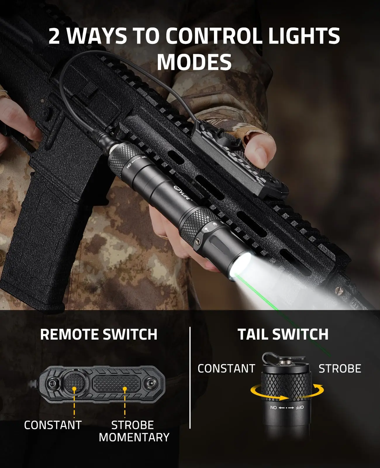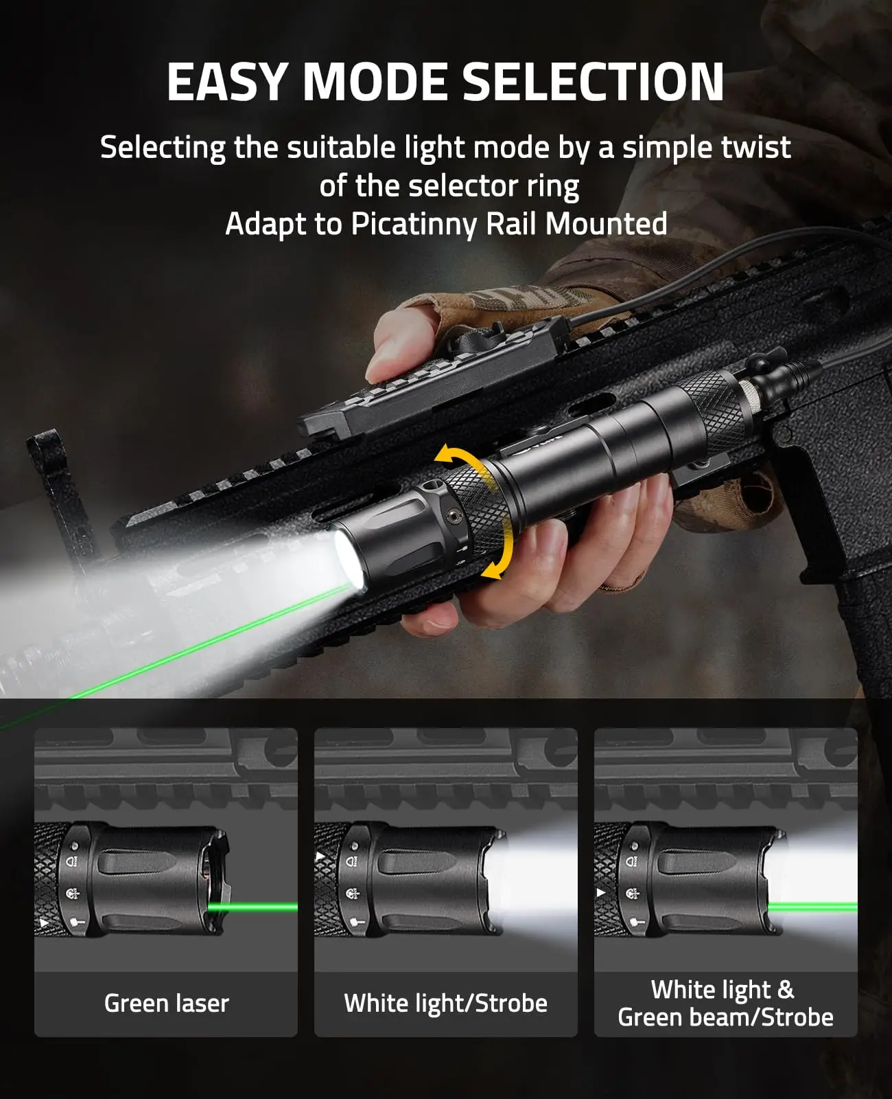 【Luz brillante】Experimente la intensidad de 1900 lúmenes de luz táctica combinada con láser verde, una gran opción para actividades al aire libre. Con un generoso tiempo de ejecución de 2,5 horas, proporciona un amplio tiempo de ejecución para su uso al aire libre. La salida del haz verde es inferior a 5mW, y la clase láser es IIIA.