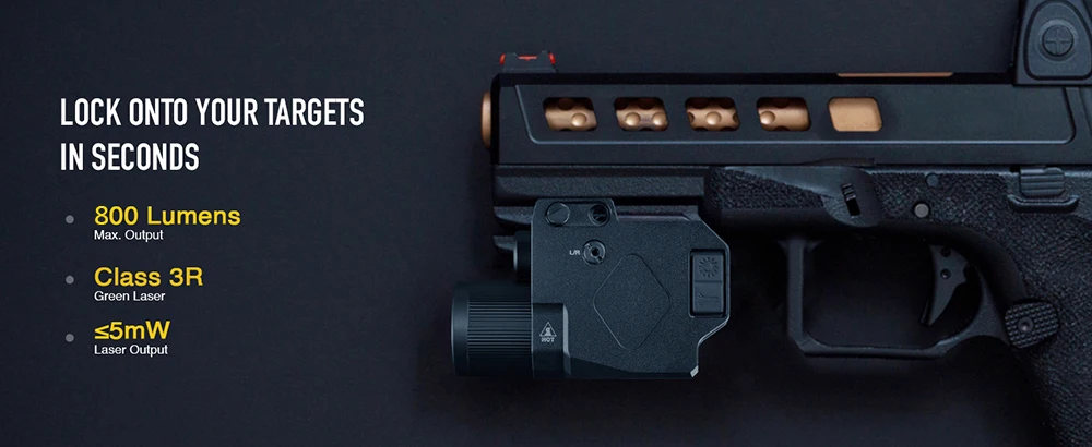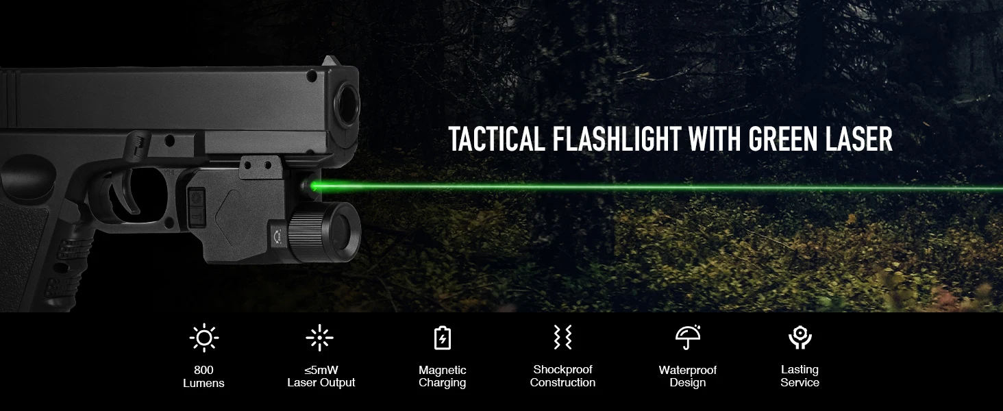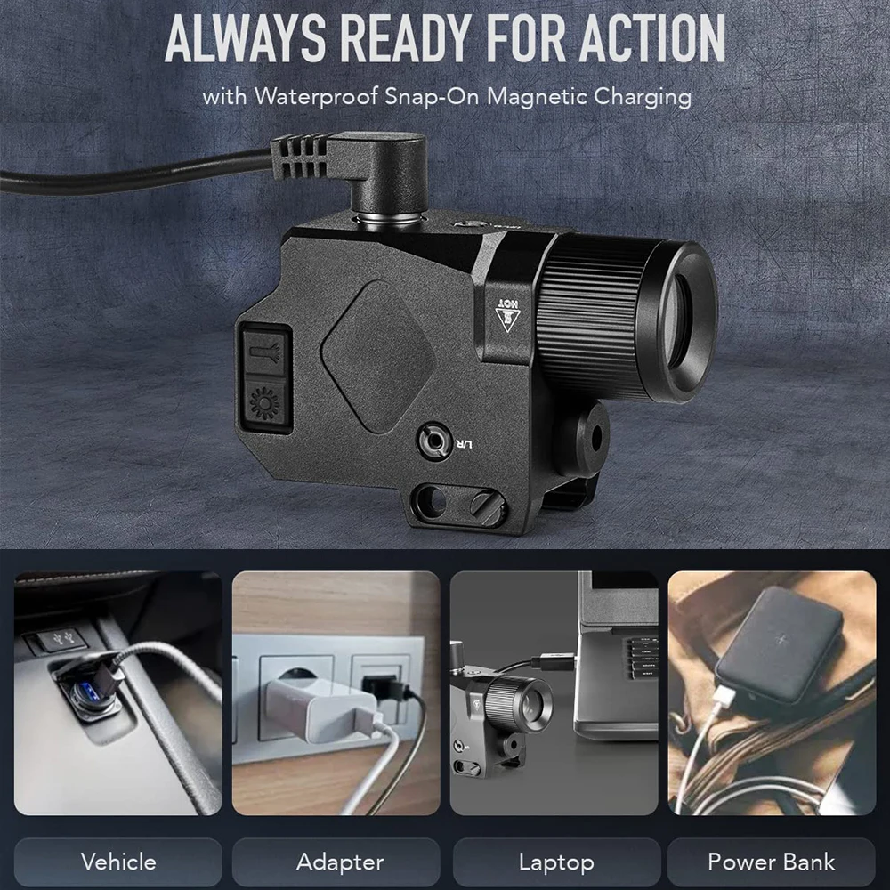 4. 【No más reemplazo de batería】Este combo de luz de pistola cuenta con un puerto de carga magnético, que proporciona hasta 50 minutos de uso simultáneo de linterna y láser verde con una carga completa (o hasta 10 horas de uso del láser verde y 1 hora de uso de linterna).