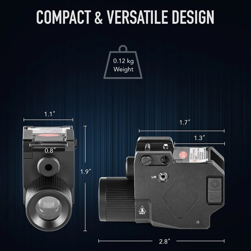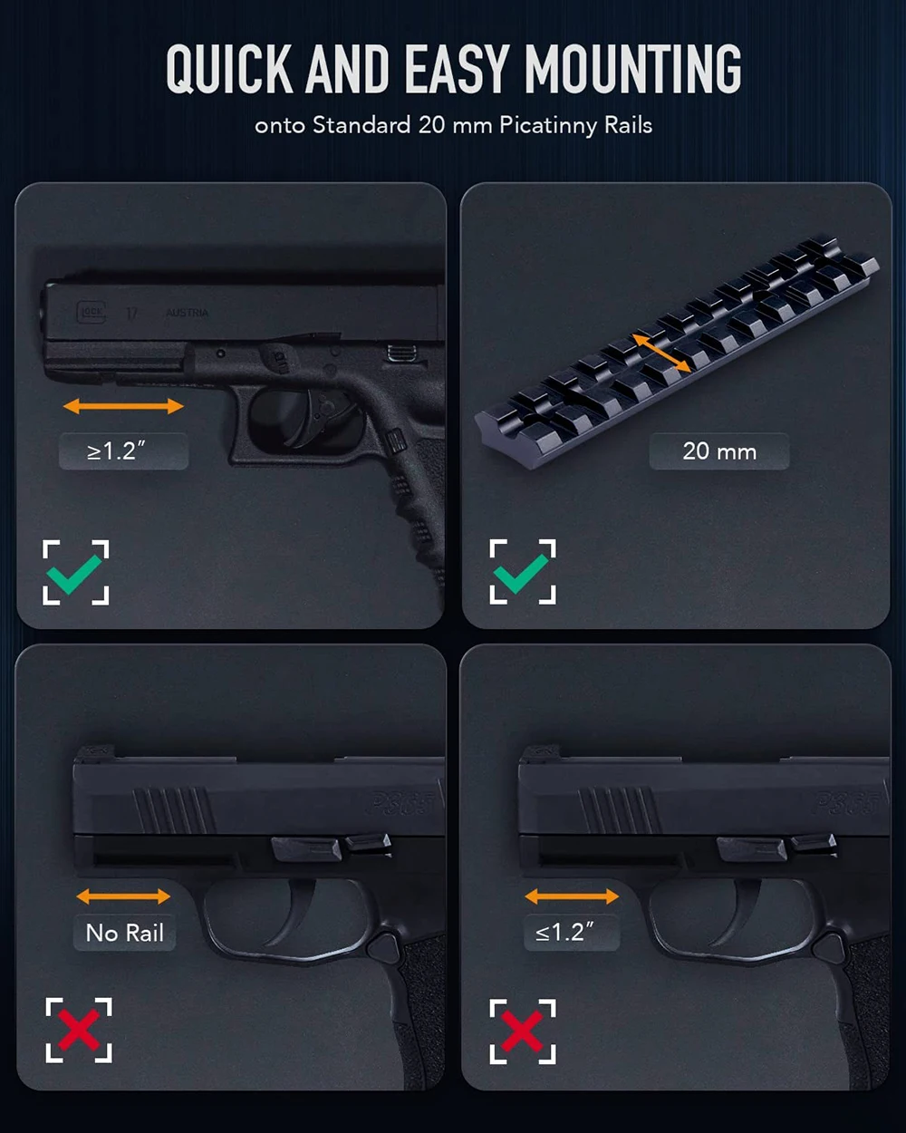 5. 【Se adapta a rieles Picatinny y Weaver de 20 mm】 ¡Nuestro combo compacto de luz para pistola se adapta perfectamente a cualquier riel Picatinny o Weaver estándar de 20 mm, perfecto para pistolas, escopetas, rifles y más!