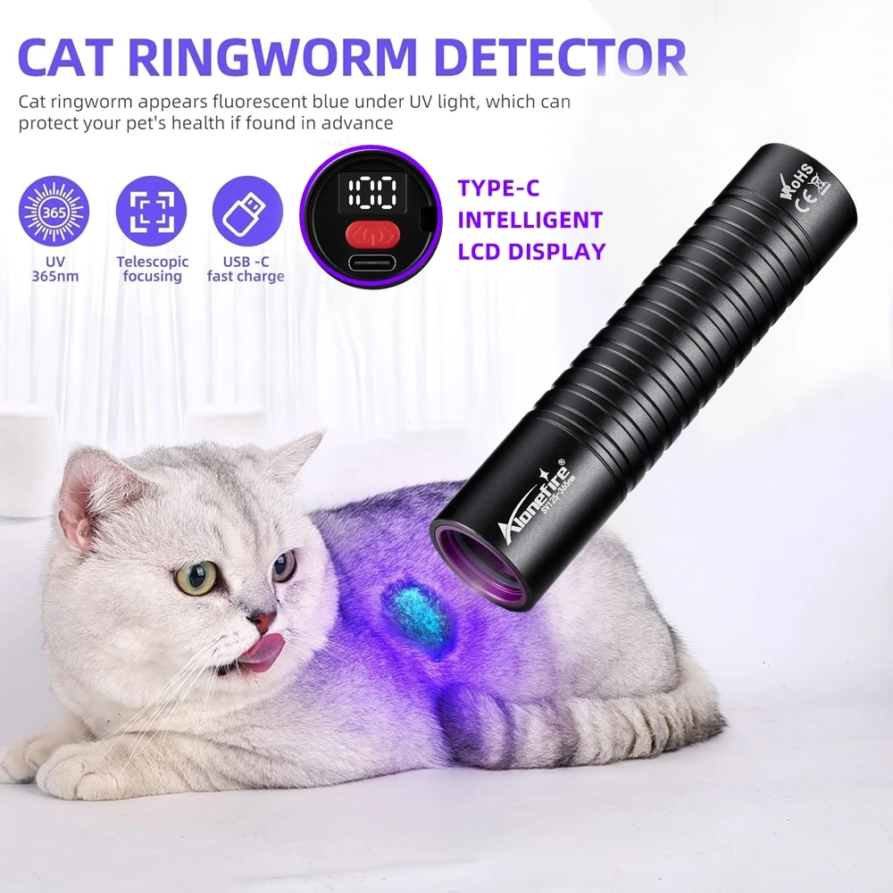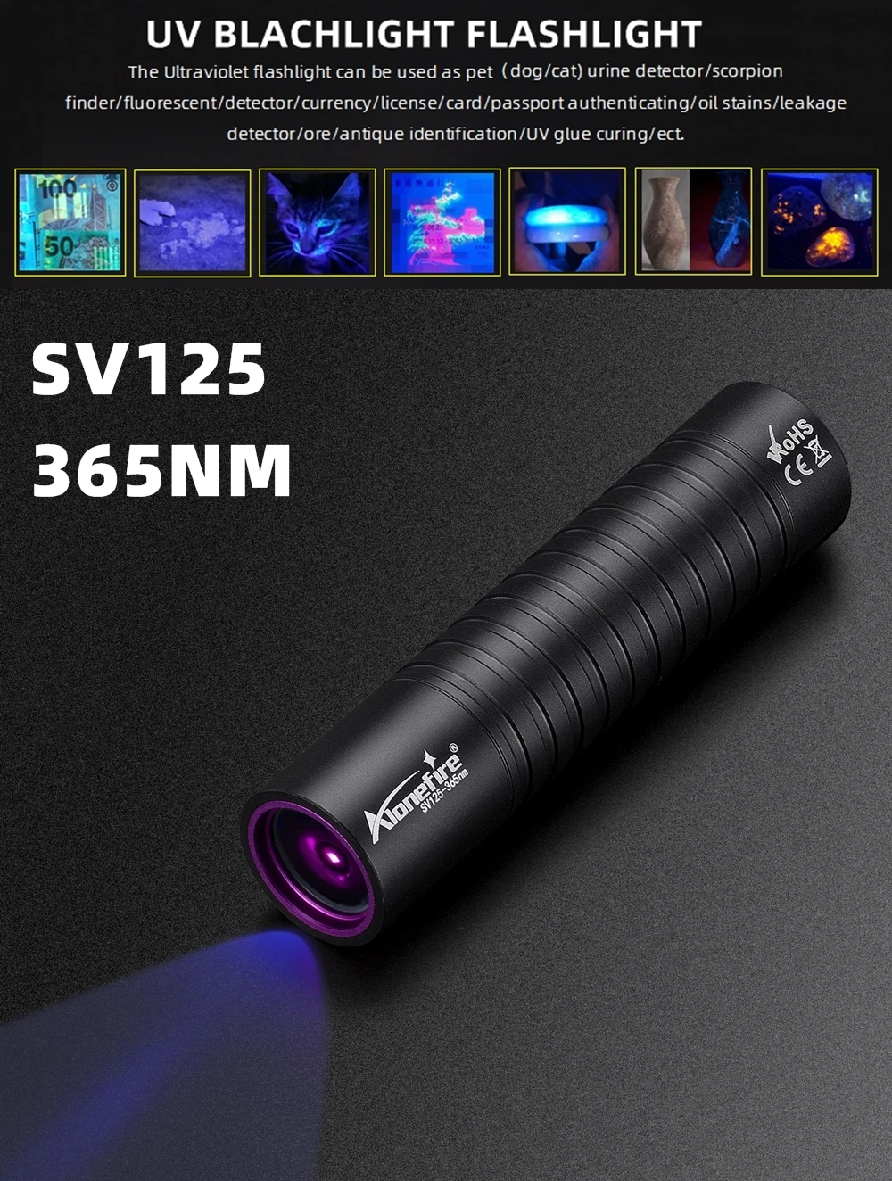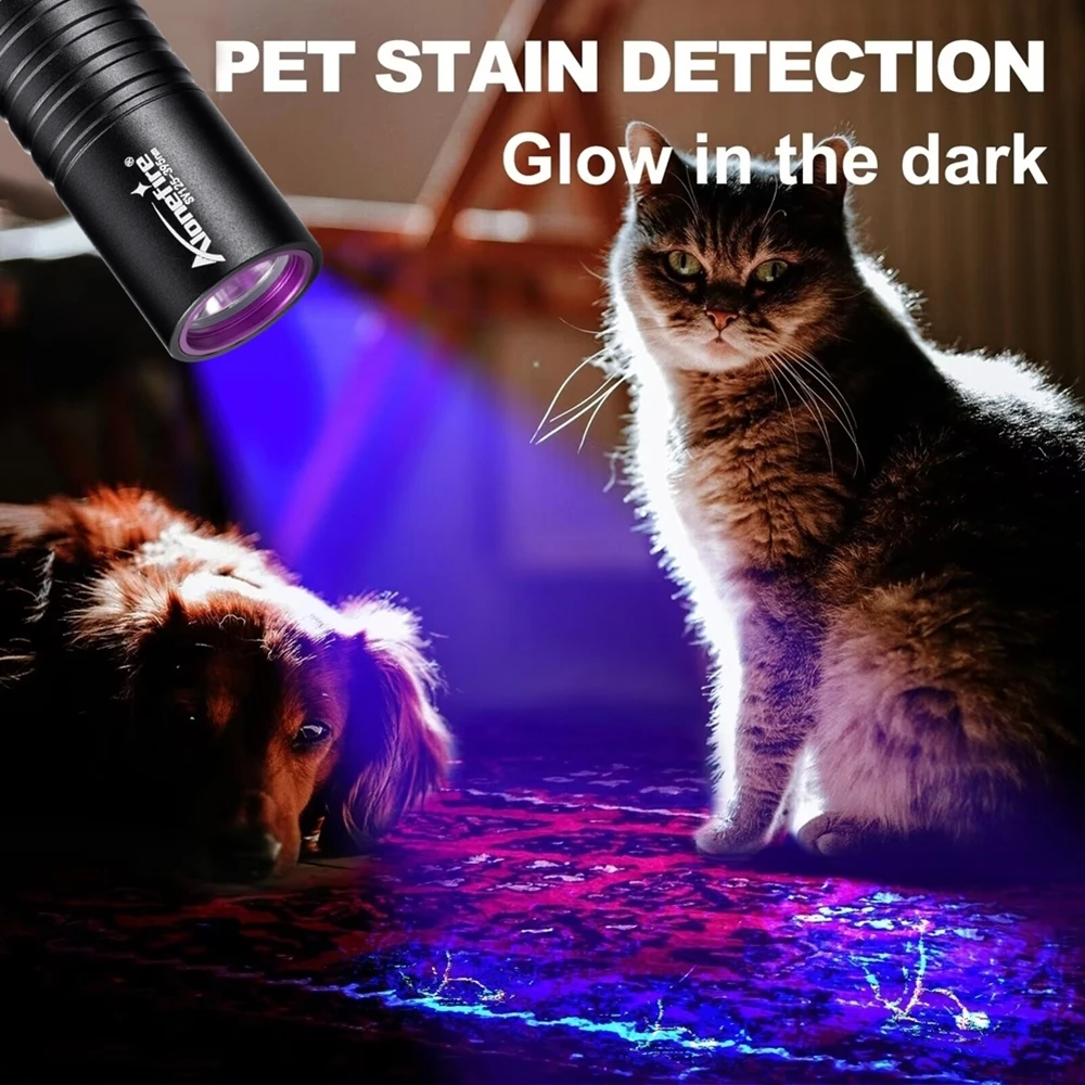 La linterna ultravioleta se puede utilizar como detector de orina para mascotas (perros/gato)/escorpión/autenticación de pasaporte/buscador/fluorescente/detector/moneda/licencia/tarjeta, etc. (En un ambiente oscuro, ¡el efecto de detección de luz violeta UV es mejor!)