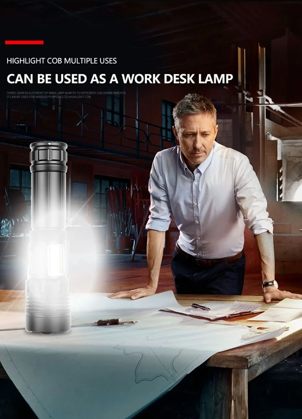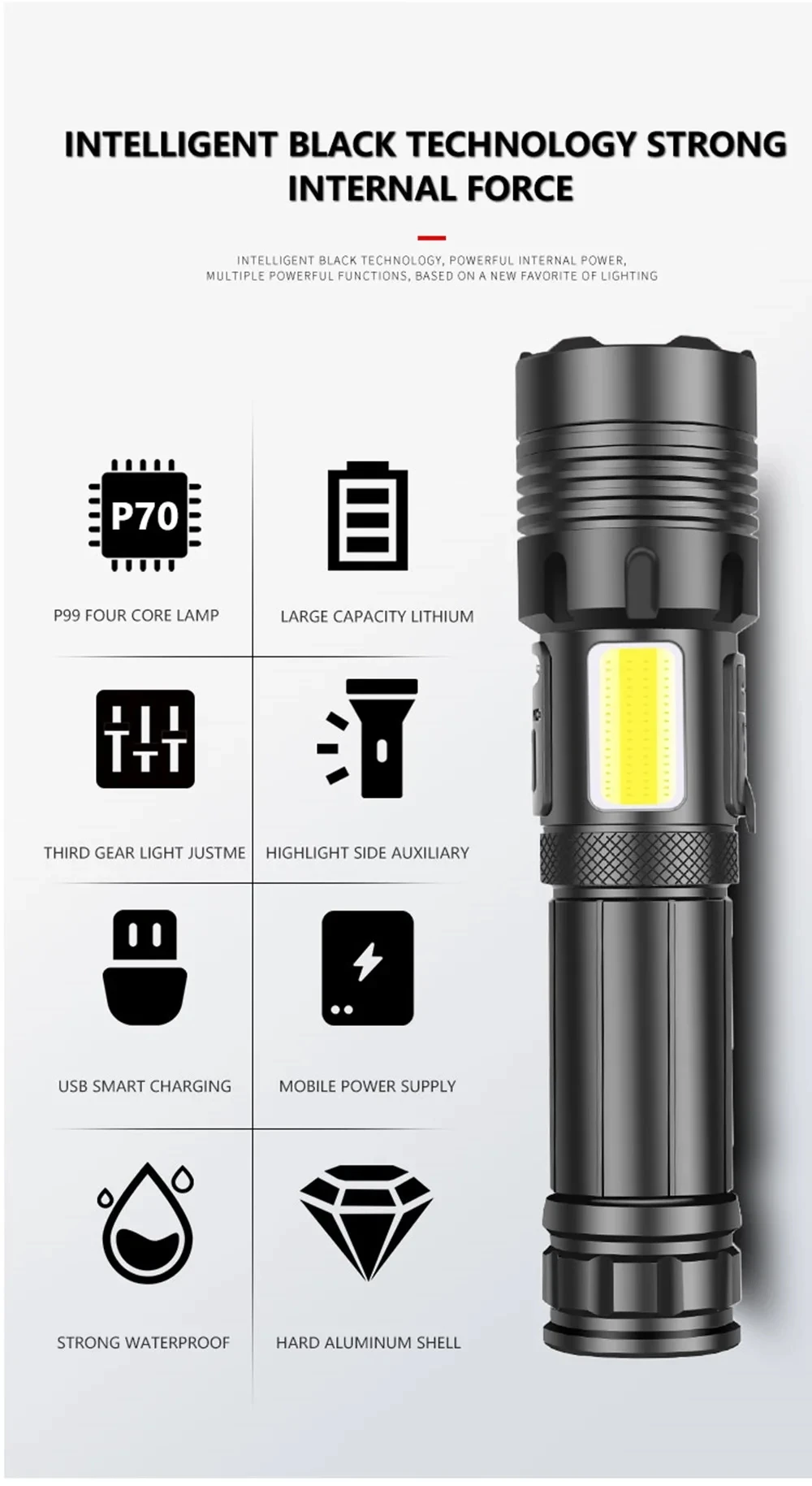 4.P70 3MODOS: Luz fuerte - luz débil - Estroboscópico - Haga doble clic para abrir COB - presione prolongadamente para apagar