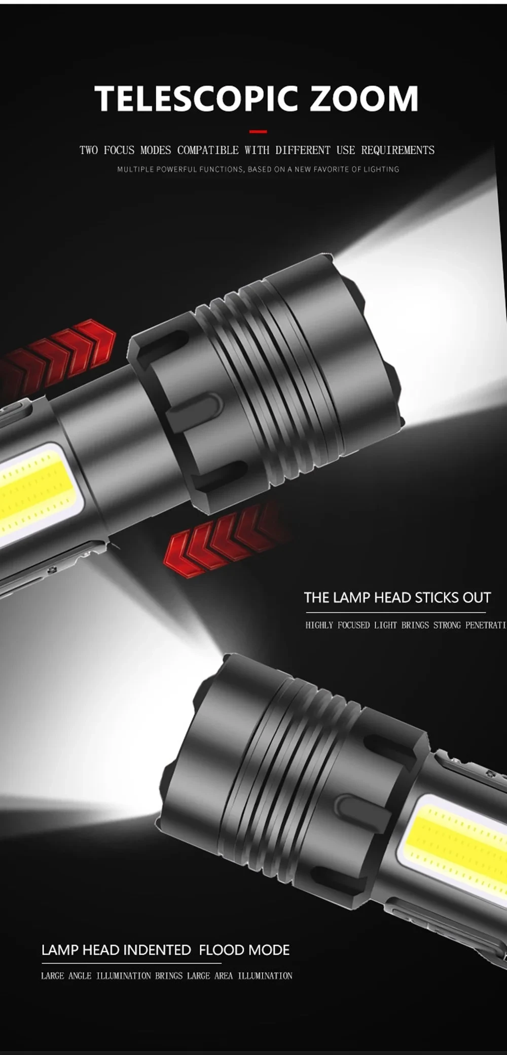 5.COB 4 MODOS: Luz fuerte - luz débil - luz roja Luz fuerte - luz roja flash