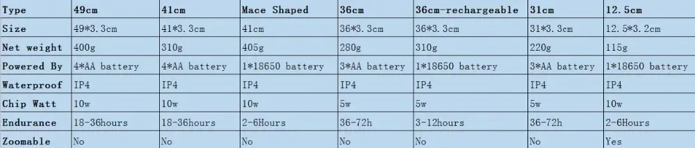 Nota: El paquete no incluye batería ni cargador.Modelo de producto: linterna de bate de béisbolMaterial del producto: aleación de aluminio.Tamaño del producto: 49 cm, 41 cm, 36 cm, 31 cm, 12,5 cmModelo de cuenta de lámpara: Perla de lámpara XML-T6 deslumbranteModo de enfoque: sin enfoqueLúmenes de fuente de luz: 220-380LMBatería aplicable: 4 * pilas AA / 3 * pilas AAVoltaje de funcionamiento: 3,7 VPeso neto del producto:49 cm-400 g, 41 cm-310 g, 36 cm-280 g, 31 cm-220 g, 12,5 cm-115 gFunción del producto:Autodefensa al aire libre, autodefensa anti-río, seguridad de emergencia, esencial para conducir sin conductor.