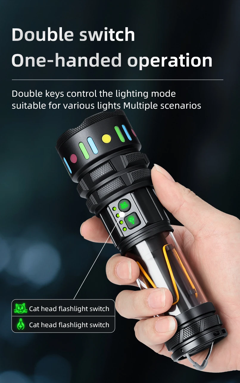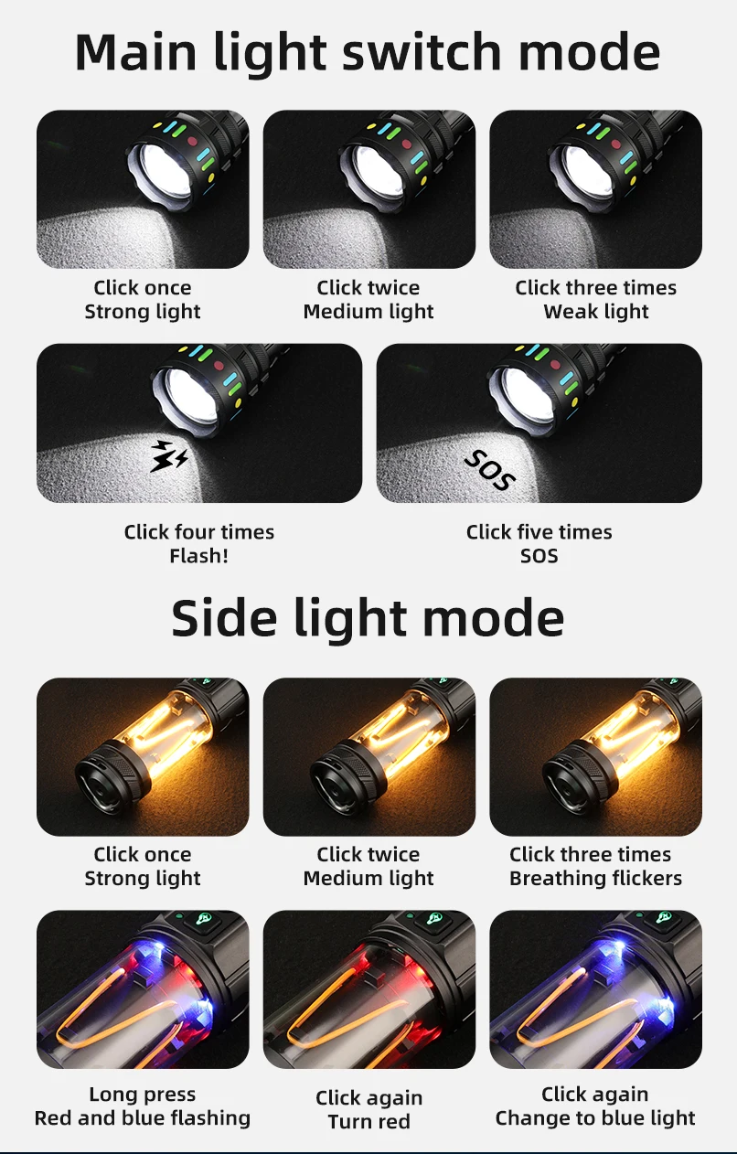 Haga clic en el interruptor de botón: Luz principal: Luz fuerte - Luz media - Luz débil -Flash - SOS