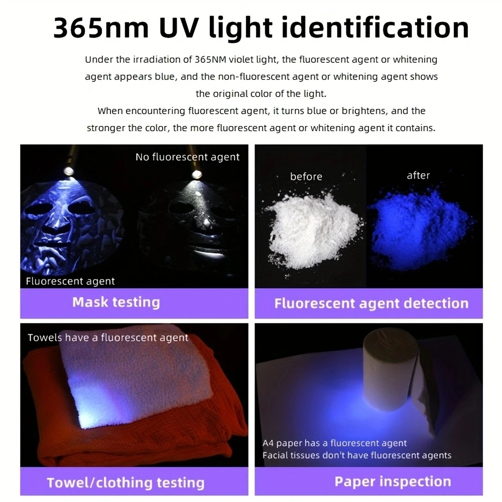 Área de aplicación: LINTERNA UV BLACHLIGHT La linterna ultravioleta se puede utilizar como mascota (perro/gato) detector de orina/buscador de escorpión/fluorescente/detector/currencycense/tarjeta/Autenticación de pasaporte/manchas de aceite/detector de fugas/Mineral/identificación antigua/curado de pegamento UV/ECT. (En el ambiente oscuro, ¡el efecto de detección de luz púrpura UV es mejor!)