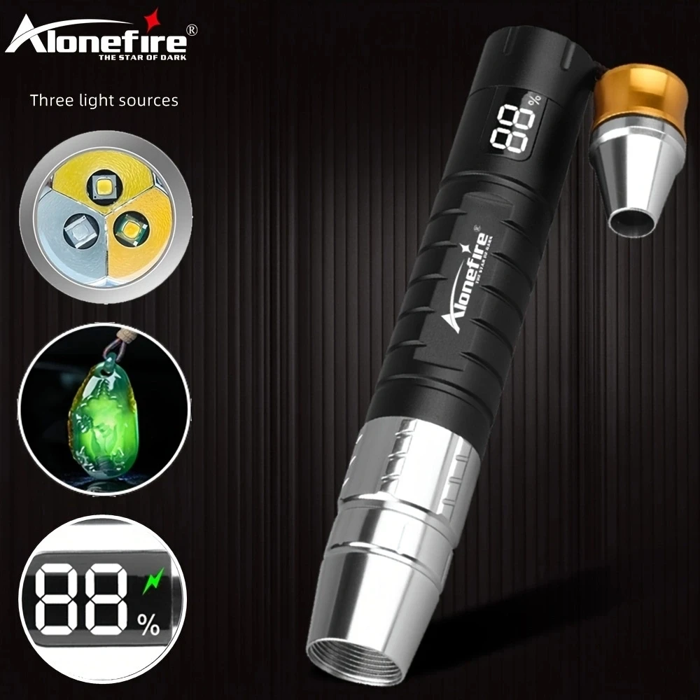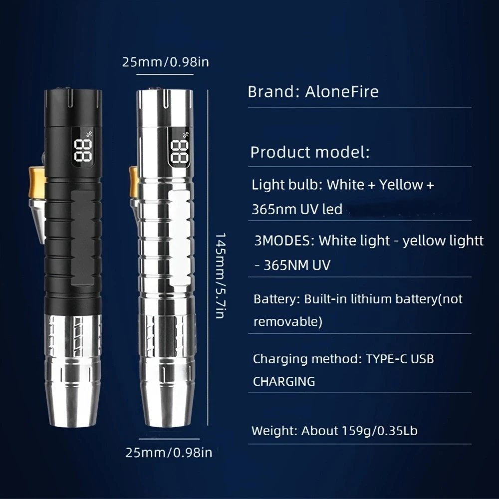 Descripción del producto: Marca: AloneFire Modelo del producto: SV105 Color del cuerpo de la linterna: negro Bombilla: Blanco + Amarillo + 365nm UV led 3 MODOS: luz blanca-luz amarilla-365NM UV Material: aleación de aluminio Batería: Batería de litio incorporada (no extraíble) Método de carga: CARGA POR USB (2) Voltaje de entrada: 5V Dimensiones: 145mm/5,7 pulgadas (longitud) x 25mm/0,98 pulgadas (cabeza) x 25mm/0,98 pulgadas (cola) Peso: aproximadamente 118g/0.26Lb