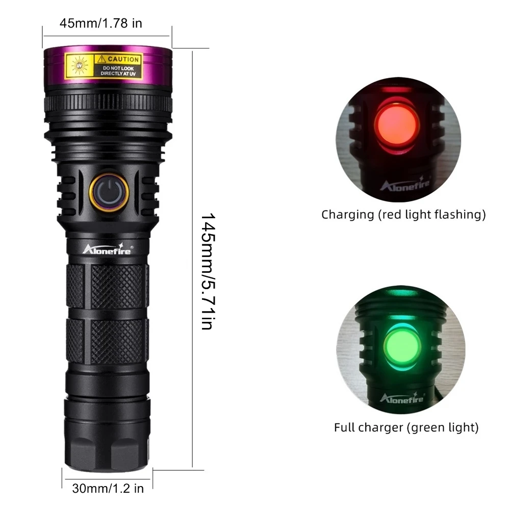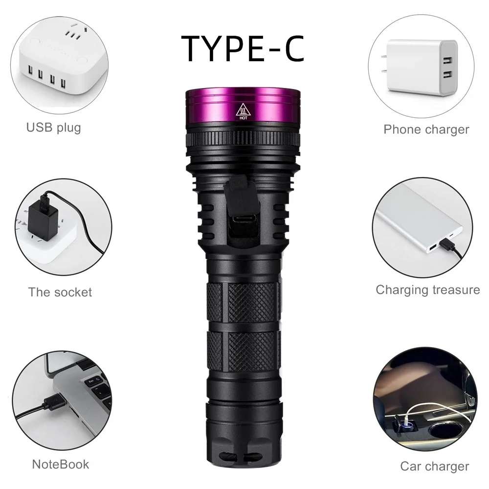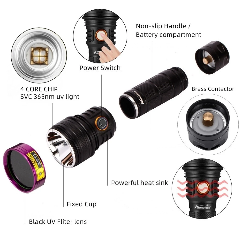 La linterna ultravioleta se puede utilizar como detector de orina para mascotas (perros/gatos)/buscador de escorpiones/fluorescente/detector/moneda/licenza/tarjeta/autenticación de pasaporte/manchas de aceite/detector de fugas/oro/identificación antigua/curado con pegamento UV/etc.