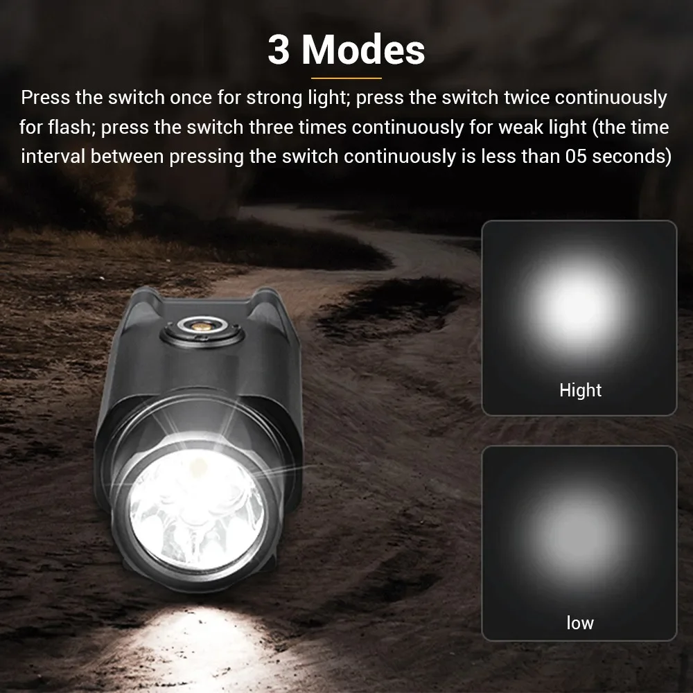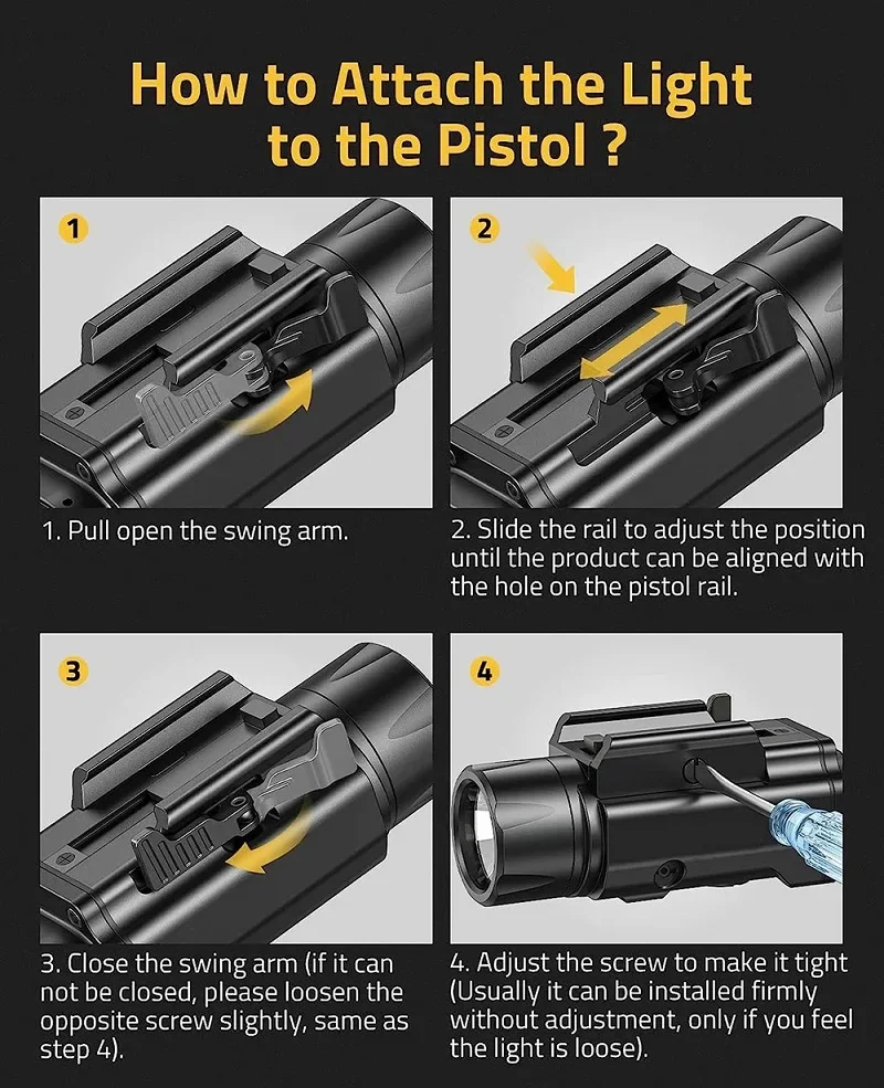 【MODOS DE LUZ MÚLTIPLES 】La lámpara LED para armas cuenta con 3 modos de luz blanca: luz fuerte, luz baja y luz estroboscópica. Los ajustes LED estables y estroboscópicos permiten cambiar fácilmente entre bloquear un objetivo o desorientarlo. Una pulsación corta produce una luz fuerte, la presión continua dos veces activa el modo estroboscópico y al presionar tres veces continuamente se activa el modo de luz débil.