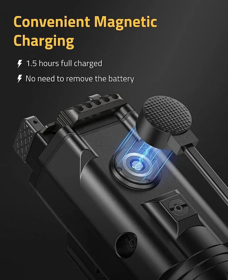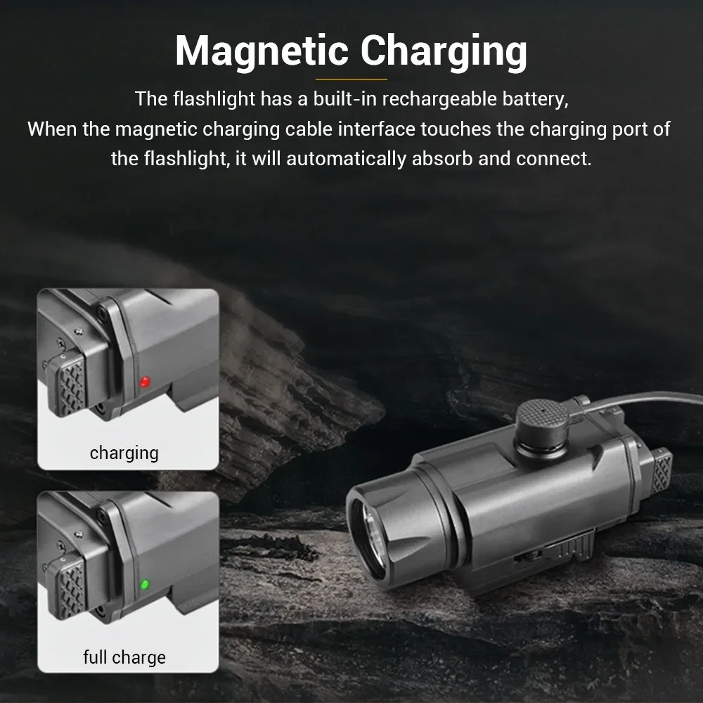 【CARGA MAGNÉTICA】 La lámpara de mini pistola cuenta con un método de carga magnética mejorado que hace que sea fácil de usar sin preocuparse por la polaridad. Se puede cargar en cualquier lugar y en cualquier momento y se carga rápidamente. La lámpara de la pistola se puede cargar completamente en 1,5 horas. Además, el extremo hembra del cable de carga magnético es a prueba de polvo e impermeable, lo que le permite soportar condiciones lluviosas sin dañarse.