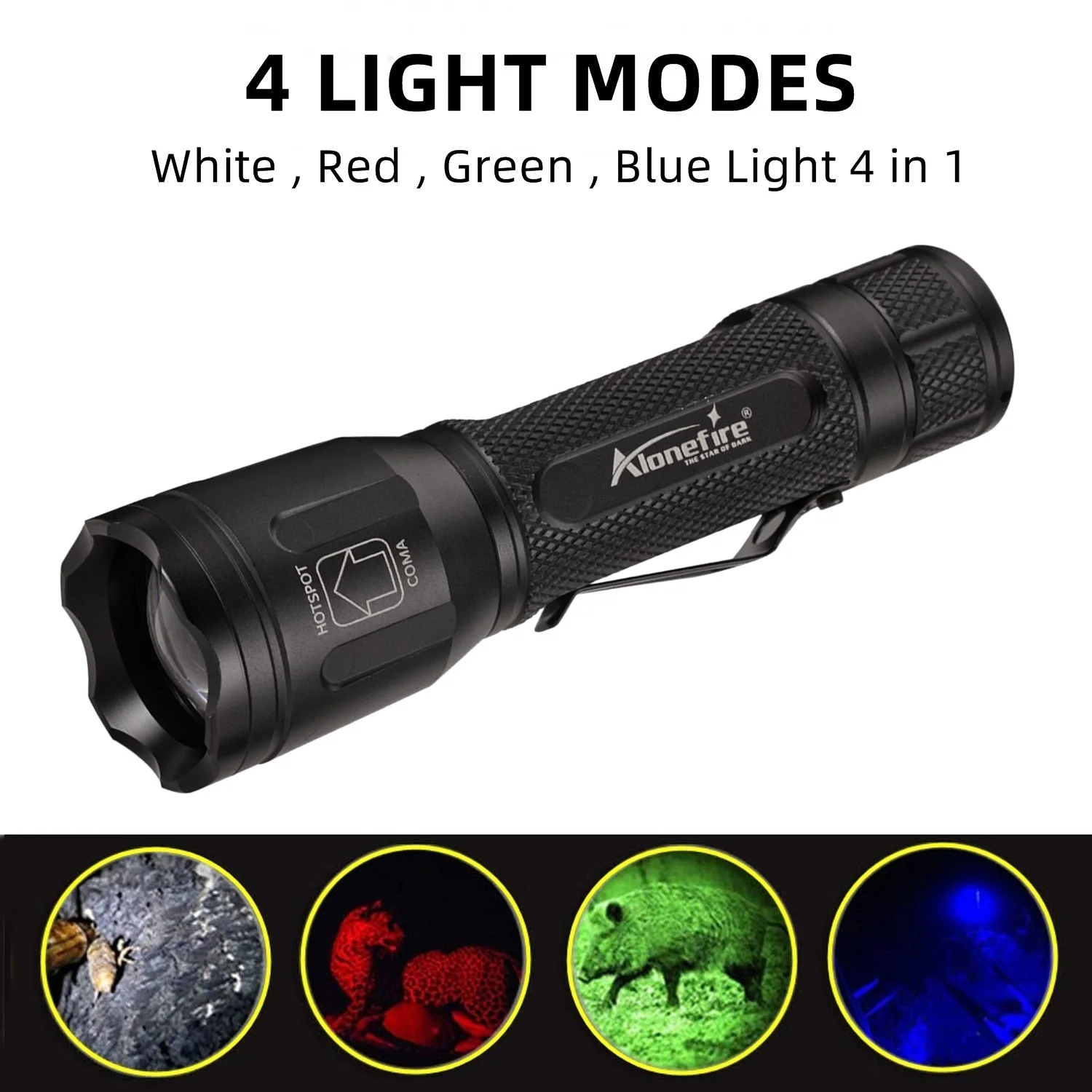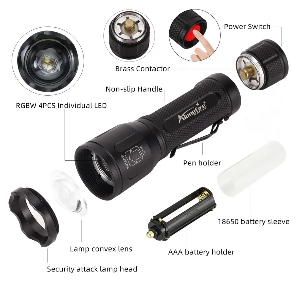 14.Batería: Para 1 batería 18650 o 3 pilas AAA Características del producto Linterna LED multicolor 4 en 1, luz de iluminación magnética de alto brillo, roja, azul, verde y blanca Aplicar a: hogar, mochilero, caza, emergencias automotrices, Pesca, escalar montañas, acampar, buscar y rescatar.Elija un nivel de brillo ideal para adaptarse mejor a su aventura.