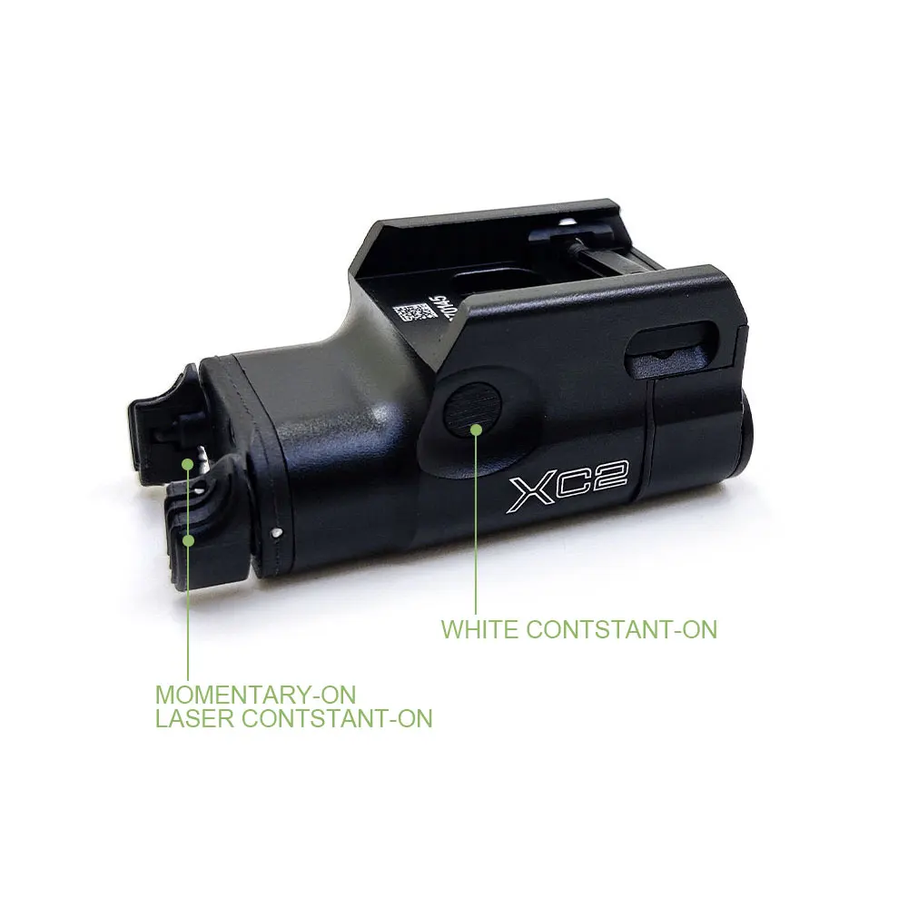 4. Press and hold either toggle switch for momentary activation and release to turn off; Mode selector switch features a light & light mode and a laser only mode;