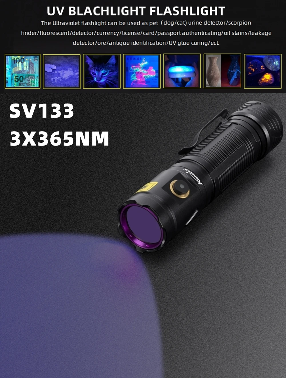 La linterna ultravioleta se puede utilizar como detector de orina para mascotas (perros/gato)/escorpión/autenticación de pasaporte/buscador/fluorescente/detector/moneda/licencia/tarjeta, etc.(En un ambiente oscuro, ¡el efecto de detección de luz violeta UV es mejor!)
