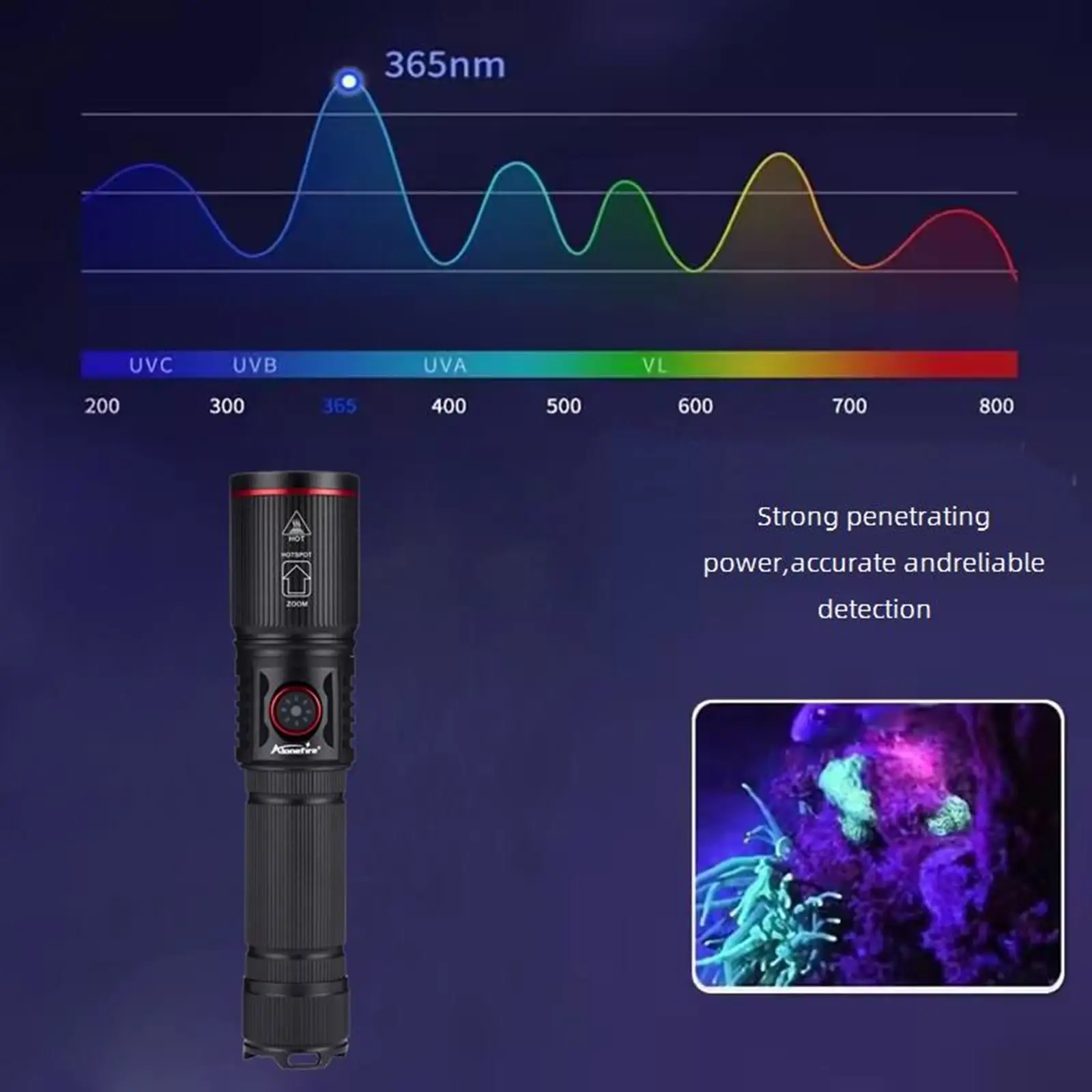 La luz ultravioleta de 365 nm es invisible a simple vista, por lo que no es tan BRILLANTE como la linterna de 395 nm, sino más perfecta para detectar una alta demanda como agentes fluorescentes y códigos de seguridad.UV de 365 nm es el espectro de detección realmente dedicado.Se puede utilizar con luz natural y funciona mejor en la oscuridad con poca fuga de luz visible.Se puede utilizar como detector de orina para mascotas (perros/gato)/escorpión/destornillador/fluorescente/detector/moneda/licencia/autenticación de pasaporte/manchas de aceite/detector de fugas/poro, etc.
