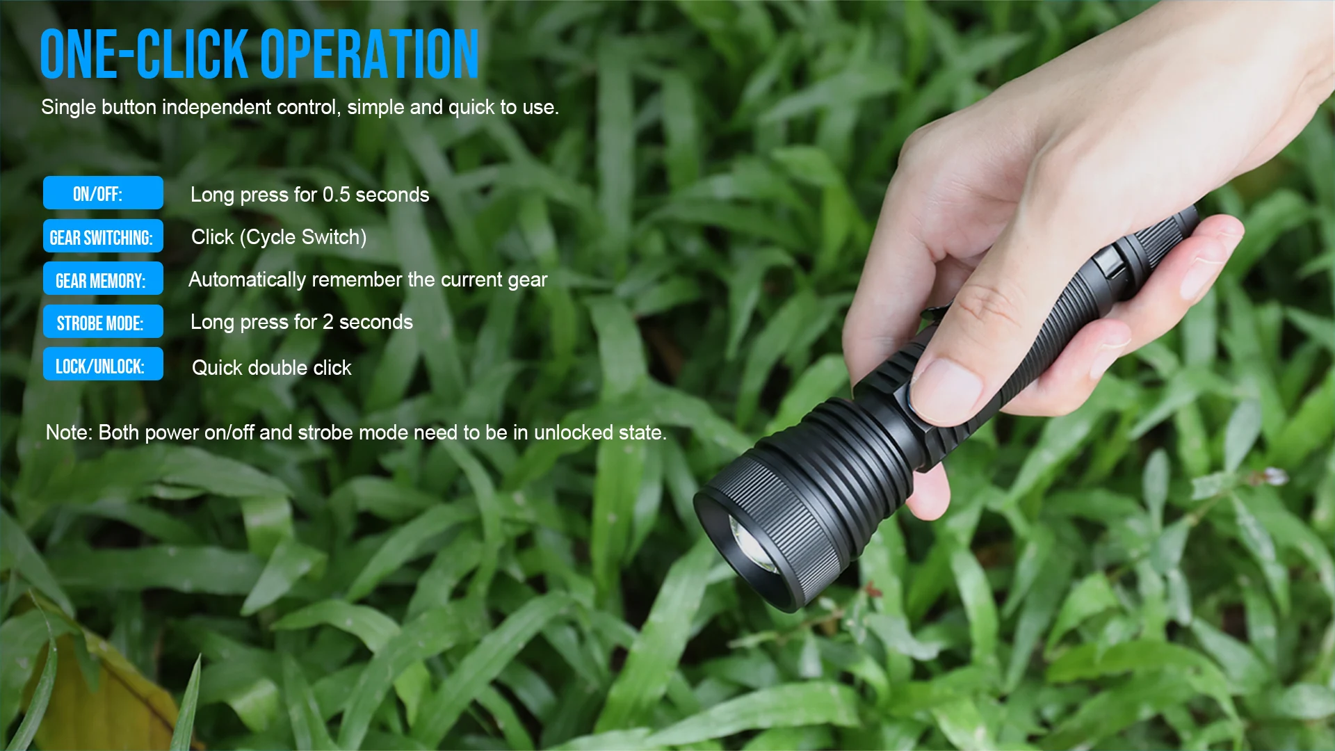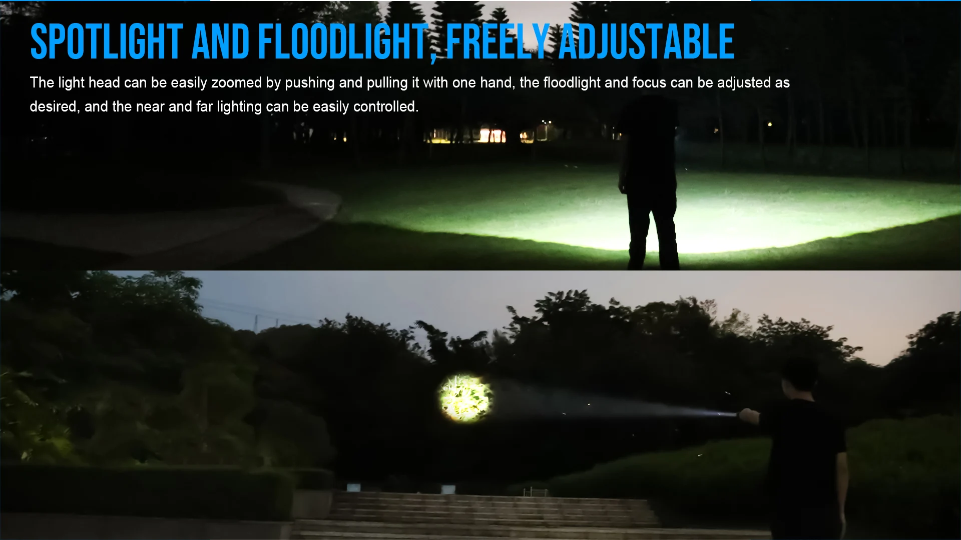 El cabezal de la luz se puede hacer zoom fácilmente empujándolo y tirando con una mano, el fioodlight y el enfoque se pueden ajustar como desee y la iluminación cercana y lejana se puede controlar fácilmente.