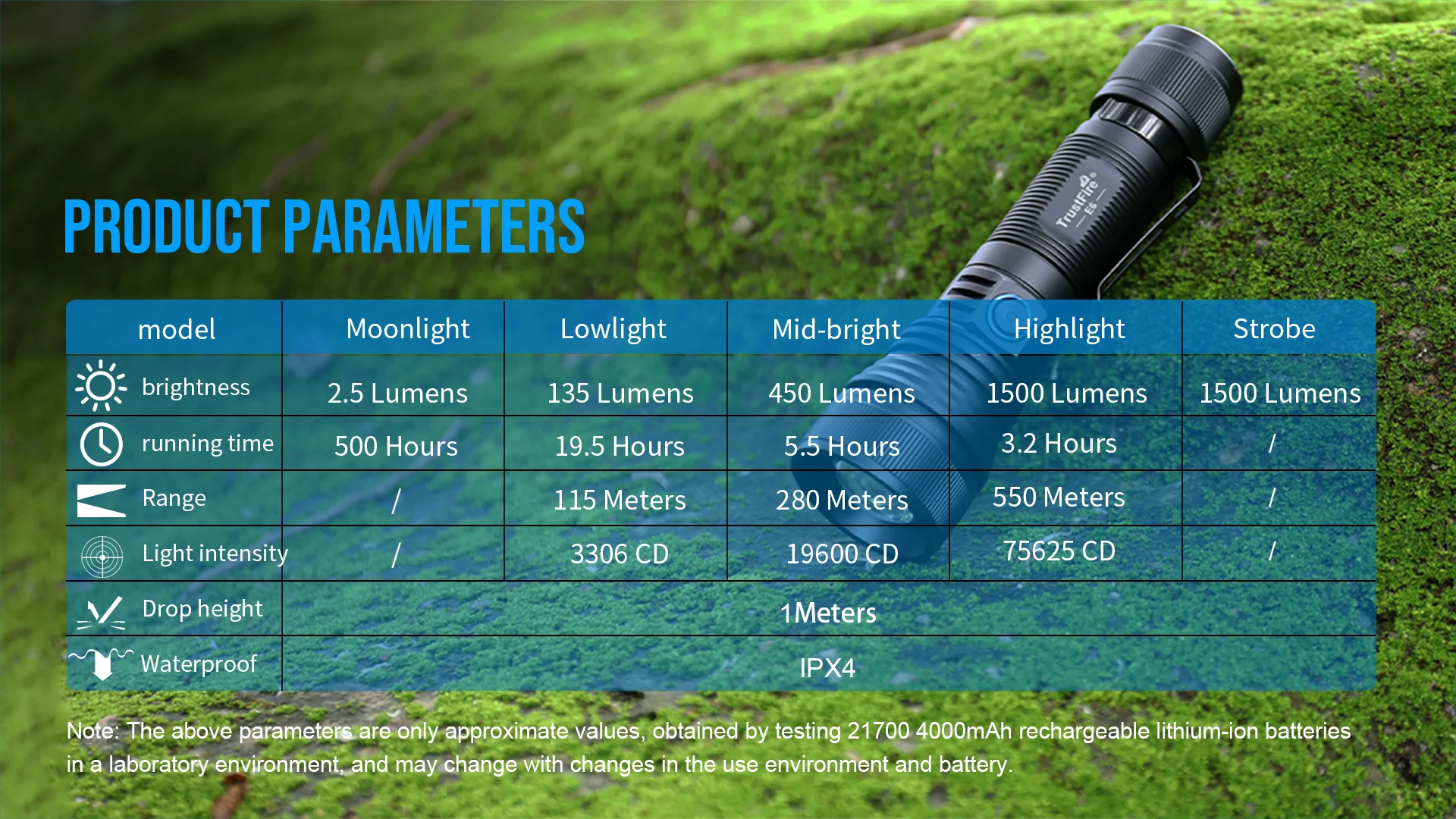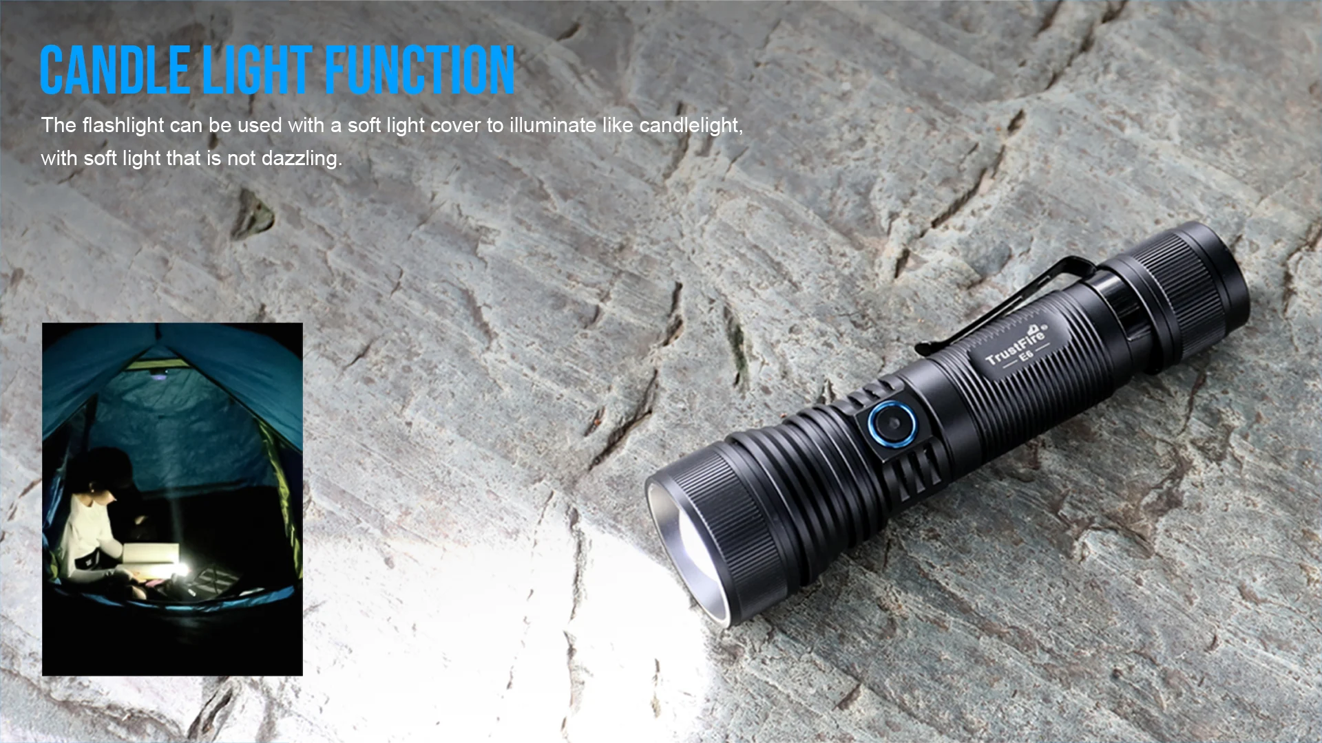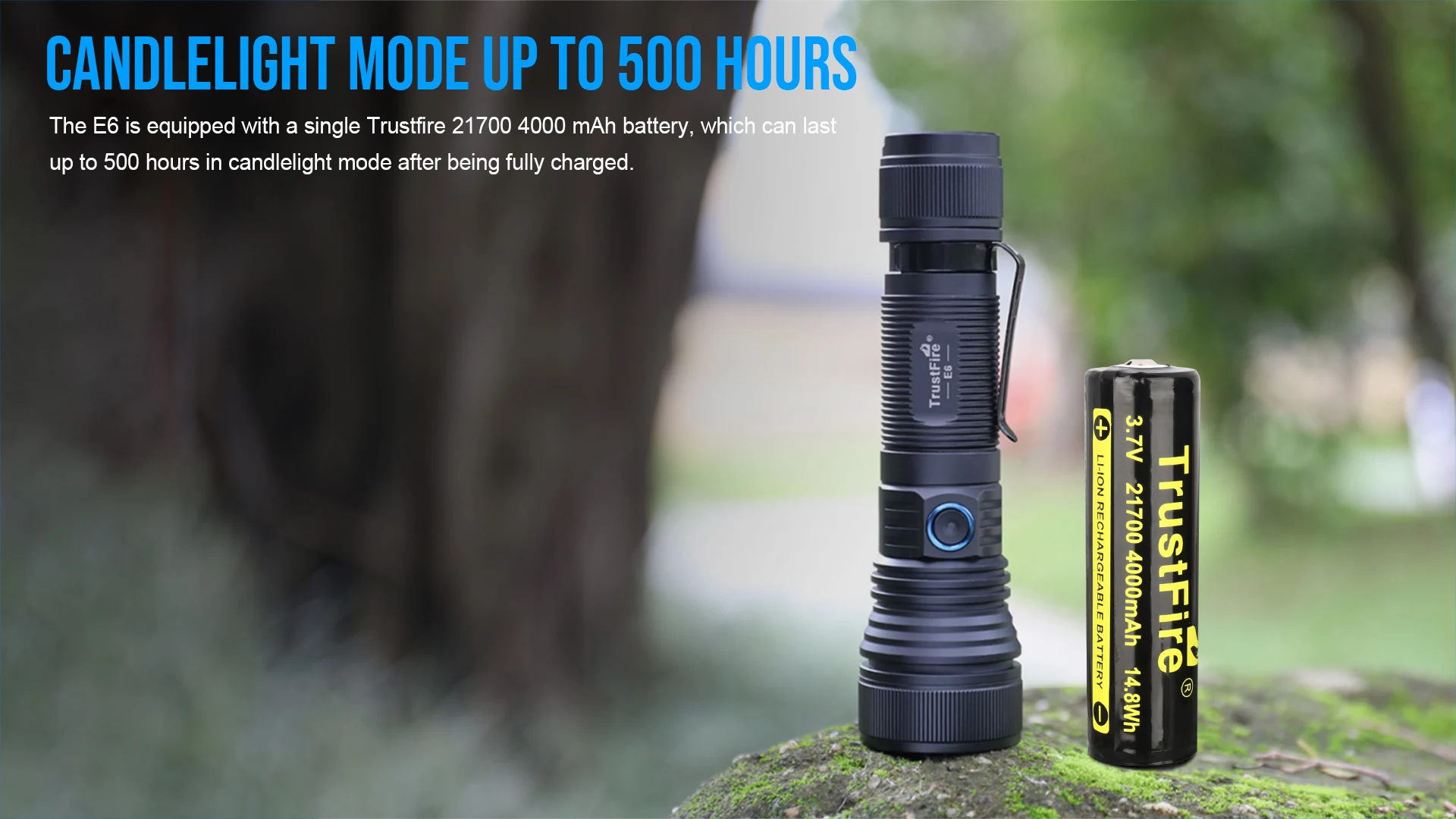 El E6 está equipado con una única batería Trustfire 21700 de 4000 mAh, que puede durar hasta 500 horas en modo a la luz de las velas después de estar completamente cargada.